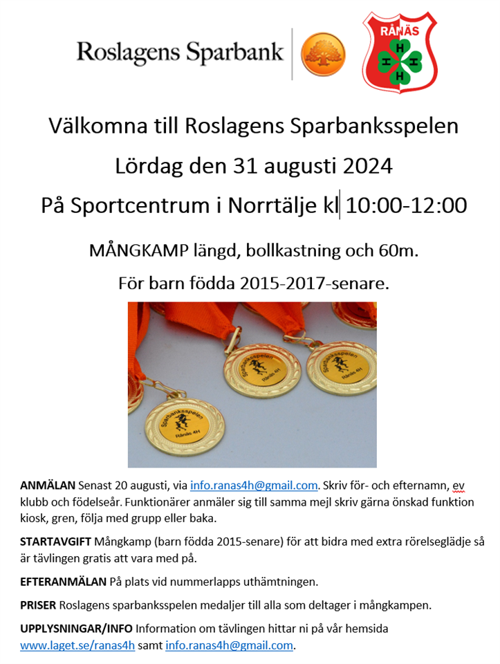Välkomna till Roslagens Sparbanksspelen Lördag den 31 augusti 2024 På Sportcentrum i Norrtälje kl 10:00-12:00 MÅNGKAMP längd, bollkastning och 60m. För barn födda 2015-2017-senare. ANMÄLAN Senast 20 augusti, via info.ranas4h@gmail.com. Skriv för- och efternamn, klubb och födelseår. Funktionärer anmäler sig till samma mejl skriv gärna önskad funktion kiosk, gren, följa med grupp eller baka. STARTAVGIFT Mångkamp (barn födda 2015-senare) för att bidra med extra rörelseglädje så är tävlingen gratis att vara med på. EFTERANMÄLAN På plats vid nummerlapps uthämtningen. PRISER Roslagens sparbanksspelen medaljer till alla som deltager i mångkampen. UPPLYSNINGAR/INFO Information om tävlingen hittar ni på vår hemsida www.laget.se/ranas4h samt info.ranas4h@gmail.com.