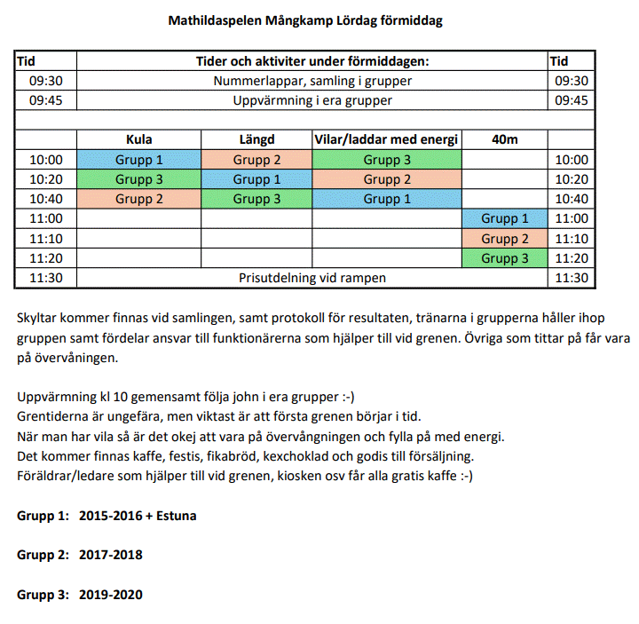 Nu är det nära på lördag tävlar vi tillsammans med gruppen. Fokus som vi pratade om att ha kul, peppa, heja och dela ut snygga guld medaljer. Vi behöver er hjälp som ni redan vet och flera har redan meddelat att de kan hjälpa till i kiosken, vid gren eller vara sjukvårdare. De som inte hjälper till vid grenen eller gruppen kommer behöva vistas på övervåningen. Grupperna kommer köra tillsammans och tränarna styr upp uppvärmningen, samlingarna osv. Ni föräldrar som hjälper till ansluter till grenarna när gruppen samlas. Kiosken kommer sälja av enklare festis/dricka, kaffe (alla funktionärer får gratis kaffe), frukt, kexchoklad och lite godis. (Swish) Nu laddar vi för Mathildaspelen 2026. Mvh Anna Blomsten Tävlingsledare Mathildaspelen