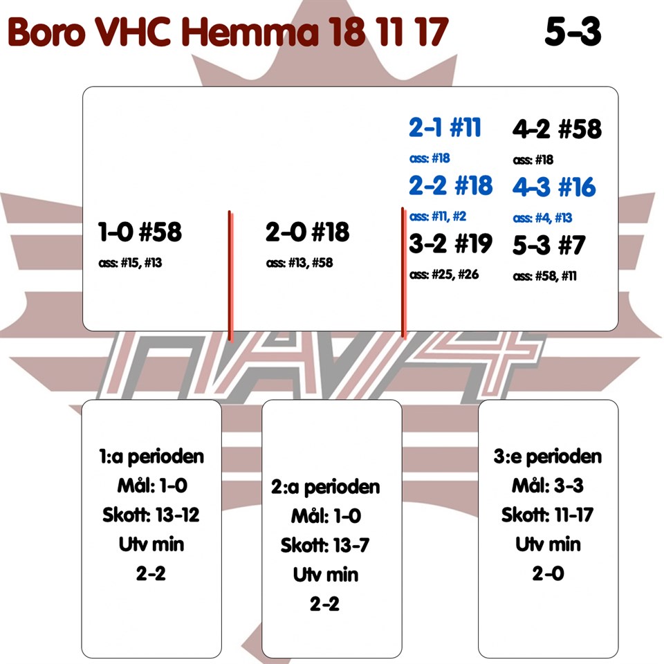 Period ett: HA74 startade perioden bra och tog välförtjänt ledningen efter 13 minuter, målet svarade Kristian Frisk för. Två minuter innan perioden var slut fick Boro VHC straff och var ytterst nära att kvittera men Gabriel Popanicic såg till att HA74 behöll ledningen perioden ut. Period två: Andra perioden var jämn från början till slut, HA74 lyckades dock ta ledningen tolv minuter in i perioden och behöll den ledningen till perioden var slut, målet gjorde Victor Wallin. Period tre: Det var ett taggat Boro VHC som kom ut i tredje perioden och de lyckades göra 2-1 samt 2-2 fem minuter in i perioden. HA74 återtog dock ledningen två minuter senare genom David Fredriksson och minuten efter det gjorde Kristian Frisk mål sitt andra mål för kvällen. Boro VHC gav inte upp utan en rejäl fight och gjorde 4-3 nio minuter från slutet, målet gjorde Jani Nylund. Alldeles i slutet plockade bortalaget ut målvakten och Simon Lantz -som gjorde comeback efter en tids sjukdom- kunde spika slutresultatet 5-3 en sekund från slutsignal. Assisterande tränare Martin Andersson har följande att säga efter matchen: -Det var skönt med seger igen efter fyra raka förluster. Extra skönt var det att vinna på hemmaplan och ge vår publik en seger, det är de väl värda! Efter Nässjö matchen har vi jobbat hårt med spelet i egen zon och det börjar bli bättre, det finns mycket kvar att jobba med men vi ser att det ger resultat. Det kändes stabilt i första och andra perioden. Boro VHC kom ut bra i tredje och lyckades göra match av det. Starkt av oss att studsa tillbaka direkt efter vår time out och lyckas göra 2 snabba mål. Nu ser vi fram emot en ny bra träningsvecka då vi spelar först på fredag. Nästa match för HA74s del är borta mot Mjölby HC på fredag, matchen börjar kl. 19.00