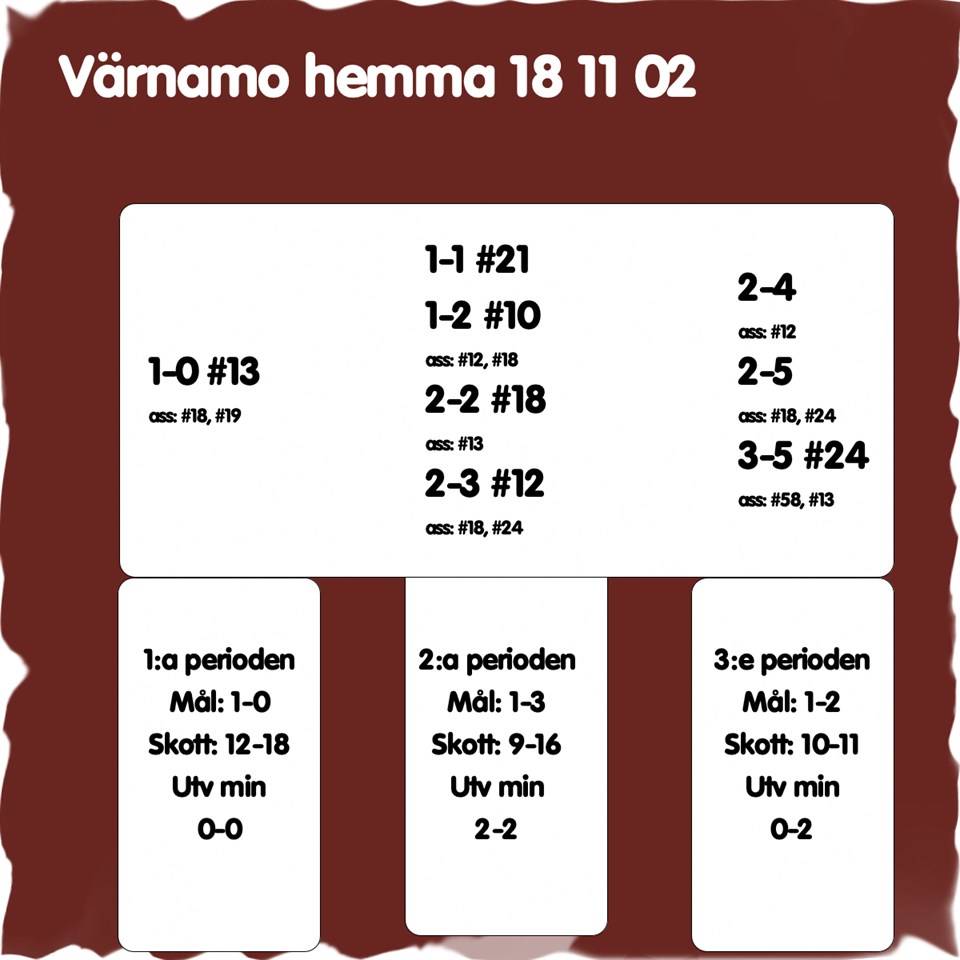 Båda lagen hade inför dagens drabbning tre raka segrar men bara ett lag skulle förlänga den sviten till fyra när matchen väl var till ända. I första perioden var spelet och chanserna någorlunda jämnt fördelade dock lyckades Värnamo GIK skapa flera längre anfall där hemmalaget inte lyckades få kontroll på pucken trots detta var det HA74 som skulle ta ledningen tolv minuter in i perioden, målet gjorde Victor Lindman. Period två började på bästa tänkbara sätt för Värnamo GIK som hann med att göra både 1-1 och 1-2 två minuter in i perioden, målen gjorde Robin Uhr och Markus Albert. HA74 lyckades dock kvittera två minuter efter Värnamo GIKs mål, målet gjorde Victor Wallin. Efter det tryckte Värnamo GIK på och lyckades återta ledningen elva minuter innan perioden var slut, målskytt var Adam Dahlin. Tredje perioden fortsatte Värnamo GIK att trycka på framåt och gjorde således 2-4 fyra minuter in i perioden, målet gjorde Martin Mörck. Värnamo GIK gjorde 2-5 åtta minuter in i perioden och då var matchen i praktiken redan avgjord, målskytt för Värnamo GIK Adam Dahlin. HA74 fick in ett tröstmål sju minuter innan slutsignalen, målskytt var Jesper Karlsson. Assisterande tränare Martin Andersson säger följande om matchen. -Värnamo GIK gjorde en bra match, samtidigt öppnar vi upp oss alldeles för mycket och ger Värnamo GIK mycket gratis. Det är bara ta nya tag till bortamatchen på söndag mot Olofströms IK, matchen börjar kl. 16.00