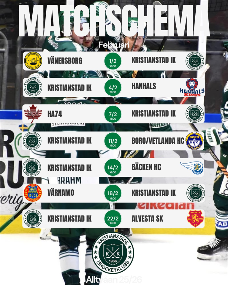 | Hockeyalliansen 74 (borta) | 7 feb, 16:00 |