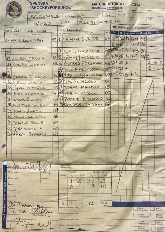 Trots nytt år så fortsätter vi ökenvandringen på samma sätt som förra året. Den här gången förlorade vi mot Nacka. Vi har ett hyfsat spel men är inte samspelade som ett lag. Backarna, med några få undantag startar inte uppspelen rätt och kedjespelarna ser bara framåt så fort vi är i anfallszon. Vi lyckas aldrig få till något eget spel i anfallszonen. Det blir luckor mellan enheterna. Vi borde ha kunnat greja nån poäng i den här matchen. Bästa formationen från Camelens sida utgjordes av sekreteriatet. Tack till Ann, Stäck och Palm som skötte allt perfekt Mål ACC: Jari Konola pass Jonas Olsson, Johan Leback Utvisningar: ACC 4 minuter, Nacka 0 minuter Skott: ACC 17, Nacka 23 Antal spelare: ACC 13, Nacka 10 +55 4 jan 2023