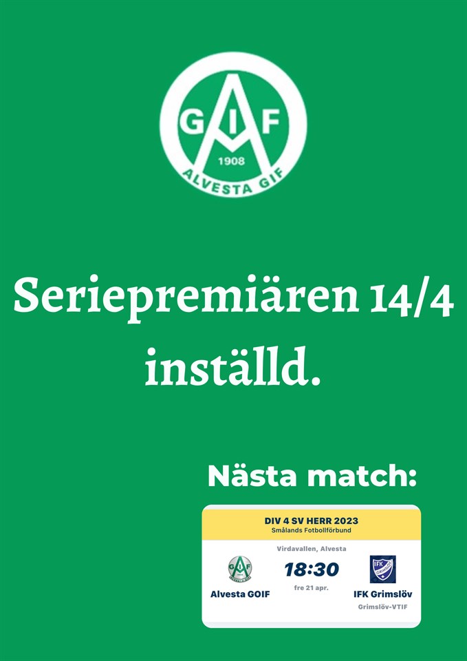 Imorgon skulle tĂ€vlingssĂ€songen 2023 dragit igĂ„ng med seriepremiĂ€r i divison 4 SV, men tyvĂ€rr har SlĂ€tthög BOIF valt att dra sig ur serien. Det betyder att vi fĂ„r ytligare en vecka pĂ„ oss att förbereda oss inför seriepremiĂ€ren. Som spelas nĂ€sta fredag pĂ„ Virdavallens konstgrĂ€s dĂ„ IFK Grimslöv gĂ€star oss. Hoppas vi ses!đ