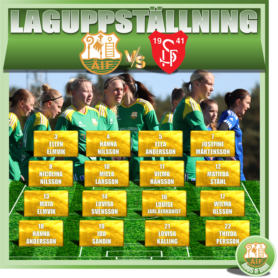 PREMIÄRTRUPPEN - ÅHUS IF-TEAM SÖDERMÖRE Äntligen dags att sparka igång seriesäsongen, med hemmamatch mot Team Södermöre. Matchstart: 13:00 Furehov konstgräs Vädret ser ut bli alldeles glimrande. NR-NAMN-MATCHER 1-Emmy Thyberg-1 [DEBUT] 3-Ellen Elmvik-14 4-Hanna Nilsson-11 6-Elin Sjöström-4 7-Josefine Mårtensson-111 8-Nicolina Nilsson-5 10-Milla Larsson-2 11-Vilma Hansson-5 12-Matilda Ståhl-68 13-Maja Elmvik-128 14-Lovisa Svensson-17 16-Louise Jarl Bergqvist-42 17-Wilma Olsson-5 18-Hanna Andersson-5 19-Ida Sandin-100 [JUBILAR] 21-Lovisa Kalling-16 MATCHPROGRAM