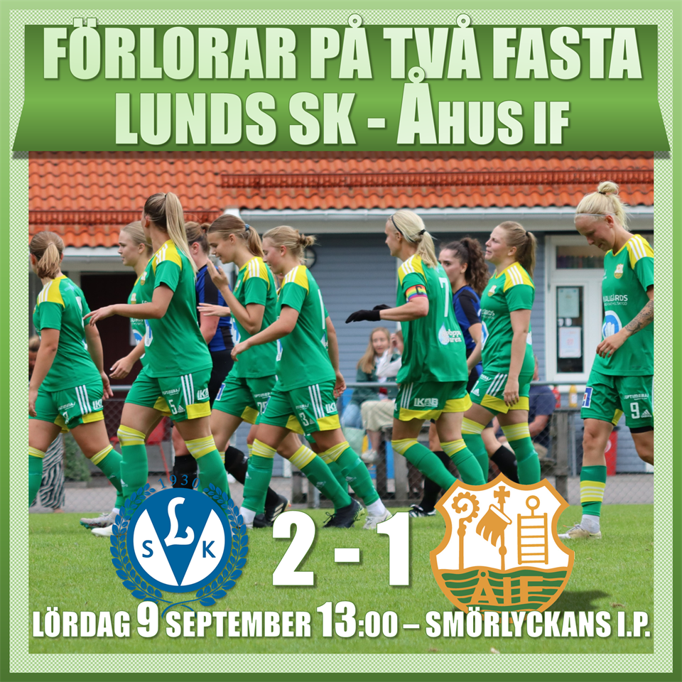 FÖRLORAR PÅ TVÅ FASTA Det blev en uddamålsförlust borta mot Lund. Två mål på hörnor, som Åhus inte kunde klura ut. Trots övertag i andra, så lyckades man inte nå seger eller kvittering. Laget hade en spelare borta pga skada, och två pga sjukdom, så var kanske lite tunna på bänken. Nästa match, hemma mot Sjöstaden (som förlorade mot Vellinge med 0-3). Åhus behåller sin 7e plats, men lagen under närmade sig, när Emmaboda skrällde och körde över Lilla Torg med 0-5, och Staffanstorp besegrade Färjestaden på Öland med 1-2. Älmhult (som Åhus besegrade i omgång 15) ser ut att gå mot serieseger. Vid vinst imorgon mot Karlshamn, så har de 9 poängs försprång, och bara fem omgångar kvar att spela. Då skulle Åhus vinst (just nu det enda lag som besegrat Älmhult) var lite extra speciell:-) _____________________________________________ Åhus tränare om säsongsavslutningen: ”En nagelbitare” Åhus IF föll med uddamålet borta mot Lunds SK i en match med två ansikten. – Jag vill ändå beskriva det som en hedersam förlust. Vi är inte riktigt med i den första halvleken men i andra halvlek tar vi över mer och mer men orkar inte trycka in kvitteringen, säger Åhus tränare Jörgen Carlsson. Fotboll/Kristianstad • Publicerad idag 16:27 Ett sjukdomsdrabbat Åhus fick en tuff inledning med sin tunna trupp. Redan efter sju minuter nickade hemmalagets Clara Kronberg in bollen efter en hörna och gästerna fick direkt börja jobba i uppförsbacke. Hemmalaget fortsatte att trycka på och var framförallt farliga på de fasta situationerna. Precis innan pausvilan kom nämligen även 2–0 efter att bollen skruvats direkt i mål från hörnflaggan. I den andra halvleken var det dock ett annat Åhus som klev ut på banan. Gästerna tog över mer och mer och efter en dryg kvart in i den andra halvleken kom det efterlängtade reduceringsmålet genom Amanda Rosengren. Men med endast 13 spelare tillgängliga för gästerna tog värmen ut sin rätt och gästerna orkade helt enkelt inte kämpa sig till en kvittering. – Vi gör en betydligt bättre insats i den andra halvleken. Vi har lägen att både kvittera och vända på matchen men det vill sig inte riktigt, säger Jörgen Carlsson, som hävdar att säsongsavslutningen kommer bli en riktig nagelbitare: – Samtidigt som vi förlorade vann lagen under oss i tabellen. Vi har flera sexpoängsmatcher kvar så det gäller verkligen att vi ger järnet säsongen ut och förhoppningsvis får tillbaka några spelare redan till nästa vecka. Lunds SK–Åhus IF 2–1 (2–0) Målen: 1–0 Clara Kronberg, 2–0 Linnea Jönsson, 2–1 Amanda Rosengren. ”Vi har flera sexpoängsmatcher kvar så det gäller verkligen att vi ger järnet säsongen ut och förhoppningsvis får tillbaka några spelare redan till nästa vecka.” Jörgen Carlsson, tränare i Åhus IF. Jonathan Nilsson, KB
