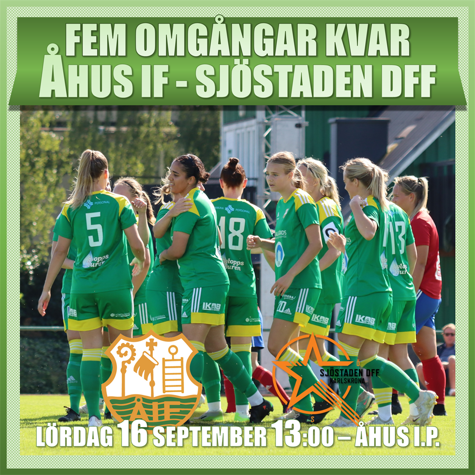 HEMMAMATCH - ÅHUS IF DAM MÖTER SJÖSTADEN Åhus IF förlorade förra matchen borta mot Lund. Efter att plockat poäng mot alla topplagen, så fick man ge sig mot seriesexan Lund. Pga skador och sjukdomar, så åkte man västerut med en lite tunn trupp. Åhus tryckte likväl på i sista halvlek, och hade övertaget, men Lund lyckades streta emot. Förra omgången bjöd på några skrällar, vilket innebar att Karlshamn, Staffanstorp och Emmaboda närmade sig Åhus, vilket gör det lite mer spännande inför serieavslutningen. Just nu är det faktiskt Karlshamn som är mest formstarkt, med 12 poäng på de senaste 5 matcherna, om än man inte gjort särskilt många mål. Sjöstaden kommer till Åhus med två förluster bakom sig [Älmhult & Vellinge]. Men, ligger alltjämnt kvar i toppen, just nu på en 4e plats. Matchstart på lördag, 13:00 MATCHPROGRAM Förutom damernas match, så är det gott om hemmamatcher i helgen. DAG-TID-ÅLDER-LAG LÖRDAG - 10:00 - 2013 - ÅHUS IF - VINSLÖVS IF LÖRDAG - 11:00 - 2011 - ÅHUS IF - FC HESSLEHOLM LÖRDAG - 13:00 - DAM - ÅHUS IF - SJÖSTADENS DFF LÖRDAG - 13:00 - 2011 - ÅHUS IF - IFK SIMRISHAMN SÖNDAG - 10:00 - 2012 - ÅHUS IF - FARSTORPS/HÖRJA SÖNDAG - 11:00 - 2014 - ÅHUS IF - FC HESSLEHOLM SÖNDAG - 12:00 - 2012 - ÅHUS IF - TYRINGE IF SÖNDAG - 14:00 - 2007/2008 - ÅHUS IF - FC STAFFANSTORP SÖNDAG - 16:00 - 2010 - ÅHUS IF - FINJA IF