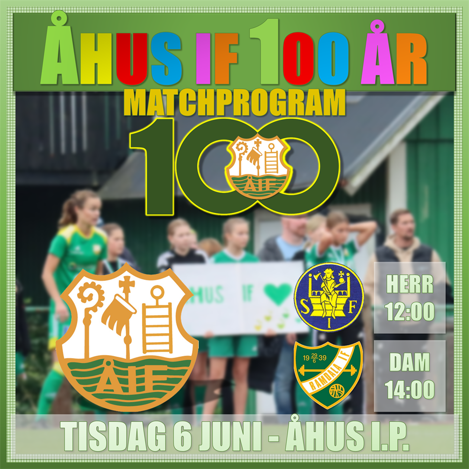 ÅHUS IF FIRAR 100 ÅR Tisdagen den 6e juni firar Åhus IF 100 år med en massa aktiviteter på Åhus I.P. Det bjuds dessutom på två hemmamatcher. Herrarna inleder kl 12:00 mot St Olof Damerna följer kl 14:00 med att möta Ramdala IF. Matchprogram kommer att uppdateras kommande dagar med laguppställningarna. MATCHPROGRAM Åhus IF 3 jun 2023 0kommentarer