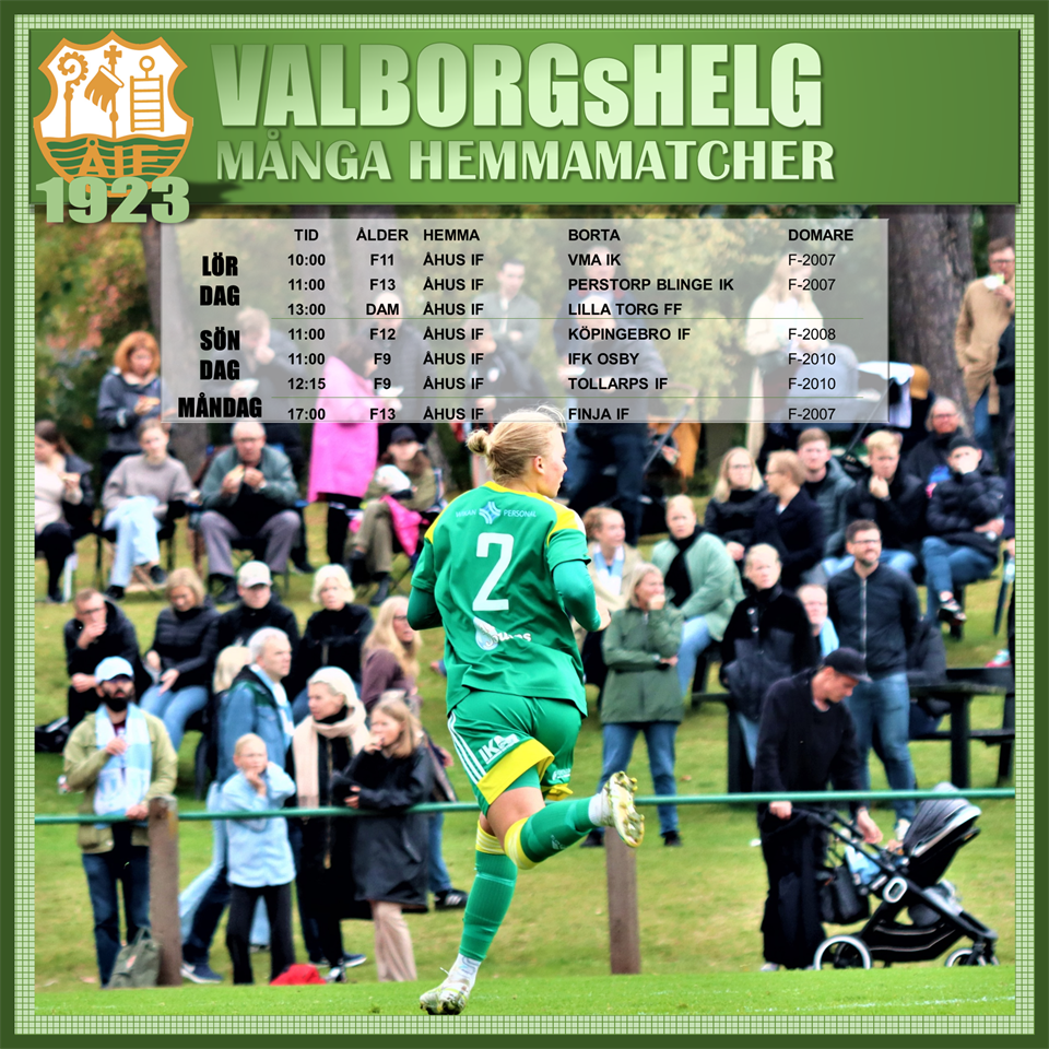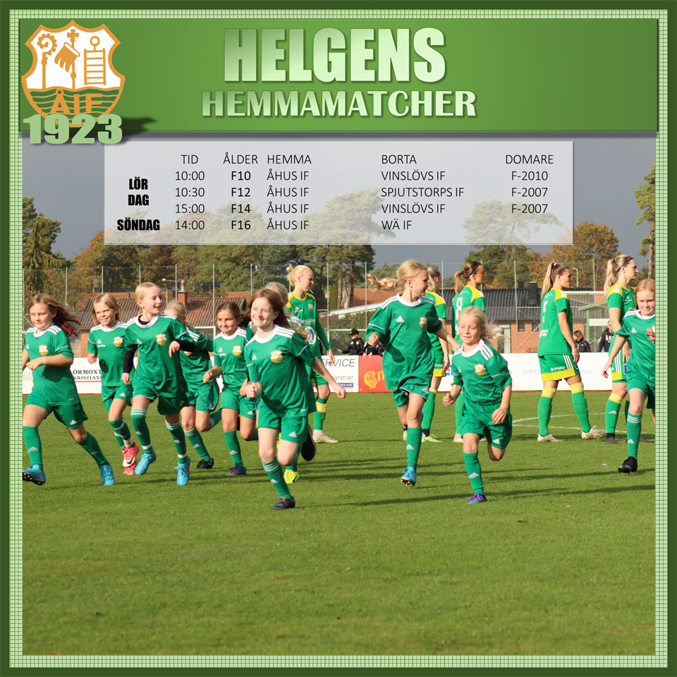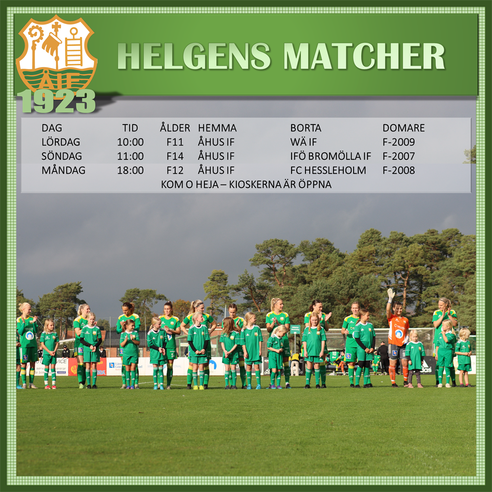 VALBORGSHELG - MÅNGA HEMMAMATCHER Förutom damernas hemmapremiär, så har vi 6 hemmatcher för ungdomslagen. Väderprognosen pekar just nu på fint fotbollsväder. LÖRDAG 10:00 F11 / ÅHUS IF-VMA IK, DOMARE - F-2007 11:00 F13 / ÅHUS IF-PERSTORP BLINGE IK, DOMARE - F-2007 13:00 DAM / ÅHUS IF-LILLA TORG FF SÖNDAG 11:00 F12 / ÅHUS IF-KÖPINGEBRO IF, DOMARE - F-2008 11:00 F9 / ÅHUS IF-IFK OSBY, DOMARE - F-2010 12:15 F9 / ÅHUS IF-TOLLARPS IF, DOMARE - F-2010 MÅNDAG 17:00 F13 / ÅHUS IF-FINJA IF, DOMARE - F-2007