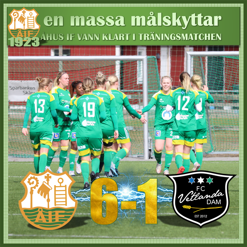 En massa målskyttar-Åhus IF vann klart i träningsmatch Det blev 6 olika målskyttar i matchen mot gästande Vetlanda FC. Två av dessa gjorde sina första mål i Åhus-IF-dressen. Vi återkommer med filmklipp. Bilder från matchen