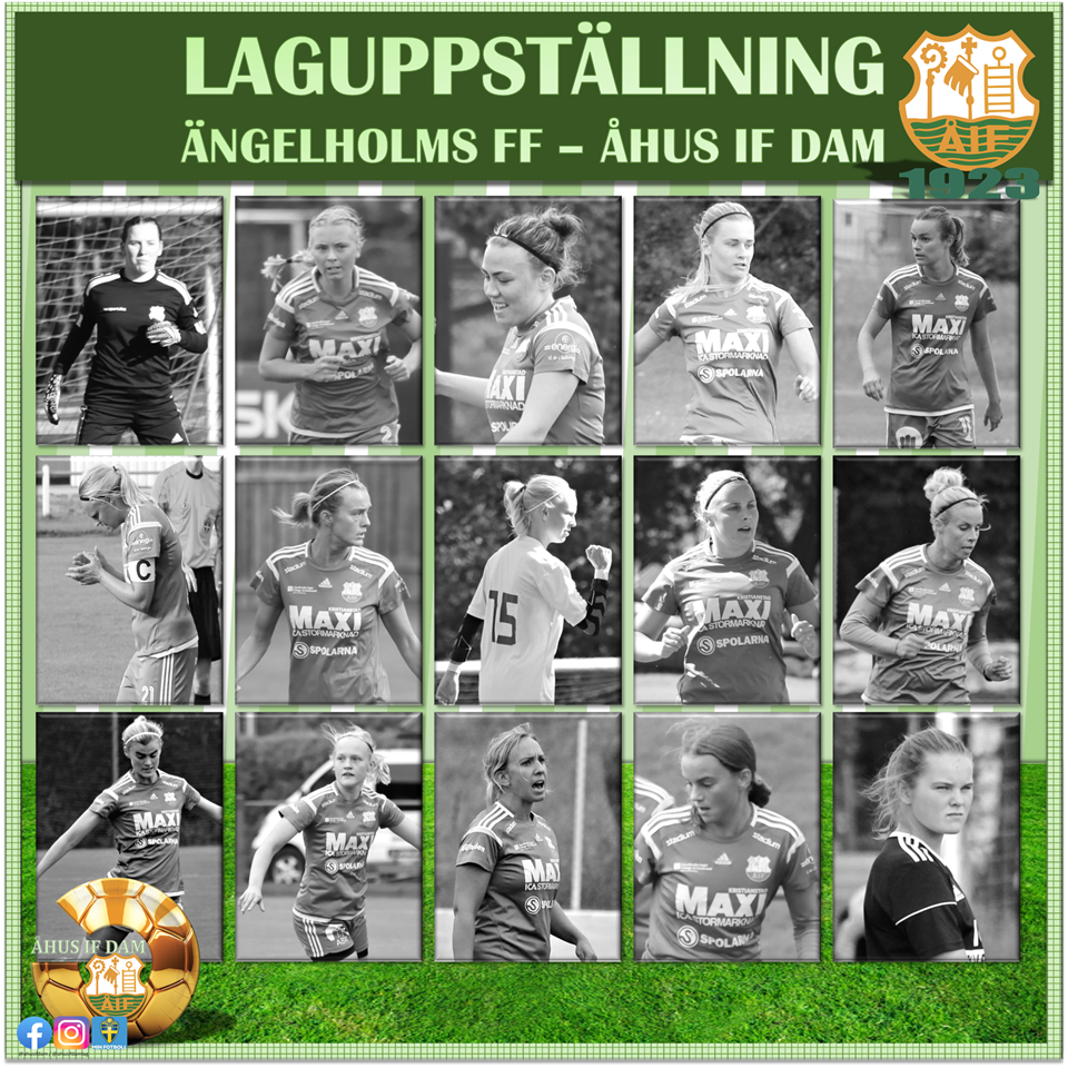TRUPPEN / ÄNGELHOLMS FF - ÅHUS IF DAM Imorgon spelar Åhus IF Dam andra matchen i serien. Åhus IF vann premiären, det blev onödigt spännande, då Åhus IF förde hela matchen - vi får skylla på premiärnerver. Ängelholms FF fick se sig slagna med 1-6 på hemmaplan mot Röke IF [som Åhus möter hemma på Åhus I.P. nästa helg. Åhus IF har ett något äldre lag än Ängelholm, som har fyllt på med yngre akademispelare. Matchstart kl 16:00 på Ängelholms I.P. NR - NAMN - MAT 1 - Zoe Rosengren - 4 2 - Maja Elmvik - 74 3 - Elsa Hjelm - 8 4 - Alice Lingstedt - 162 6 - Matilda Ståhl - 34 7 - Josefine Mårtensson - 62 8 - Zinett Fritzon - 69 9 - Amanda Rosengren - 26 10 - Matilda Andersson - 63 11 - Sofie Andersson - 34 12 - Gudlaug Rut Thorsdottir - 64 13 - Linn Bergqvist - 14 19 - Ida Sandin - 52 20 - Saga Alvesson - 23 99 - Ida Carlsson - 31