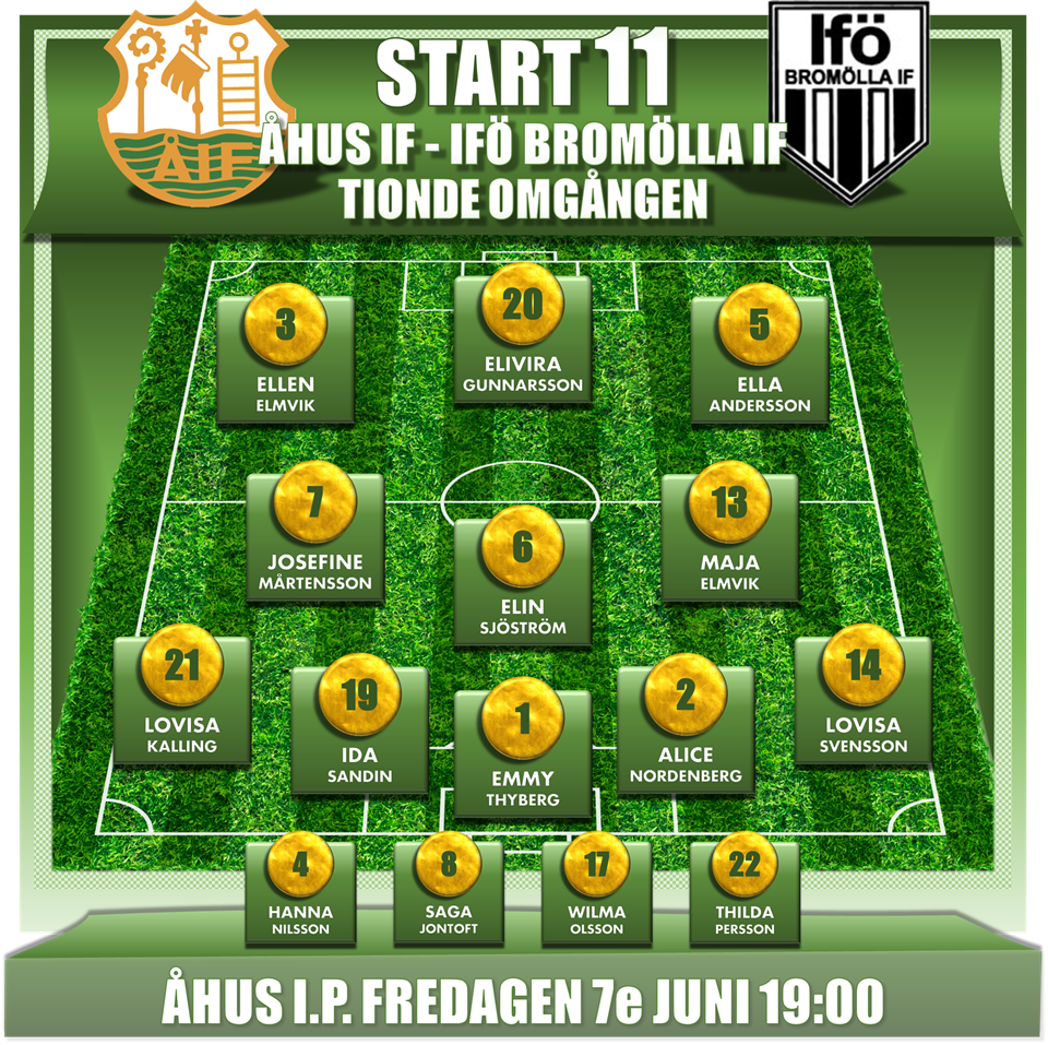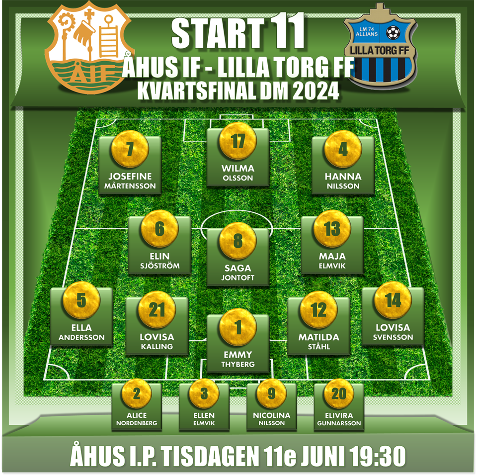 START 11 / ÅHUS IF-LILLA TORG FF Åhus IF Dam spelar en historisk kvartsfinal i DM. Motståndare är rutinerade laget Lilla Torg FF. NR-NAMN-MATCHER-POSITION 1-Emmy Thyberg-8 [MV] 5-Ella Andersson-53 [YB] 21-Lovisa Kalling-27 [YB] 12-Matilda Ståhl-77 [MB] 14-Lovisa Svensson-27 [YB] 8-Saga Jontoft-45 [DM] 6-Elin Sjöström-14 [OM] 13-Maja Elmvik-139 [OM] 7-Josefine Mårtensson-121 [F] 17-Wilma Olsson-15 [F] 4-Hanna Nilsson-22 [F] 2-Alice Nordenberg-10 [A] 3-Ellen Elmvik-25 [A] 9-Nicolina Nilsson-8 [A] 20-Elvira Gunnarsson-16 [A]