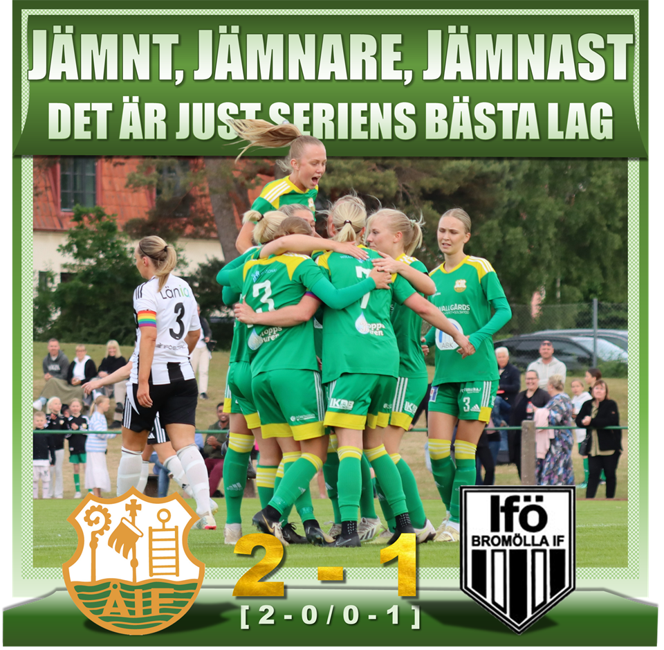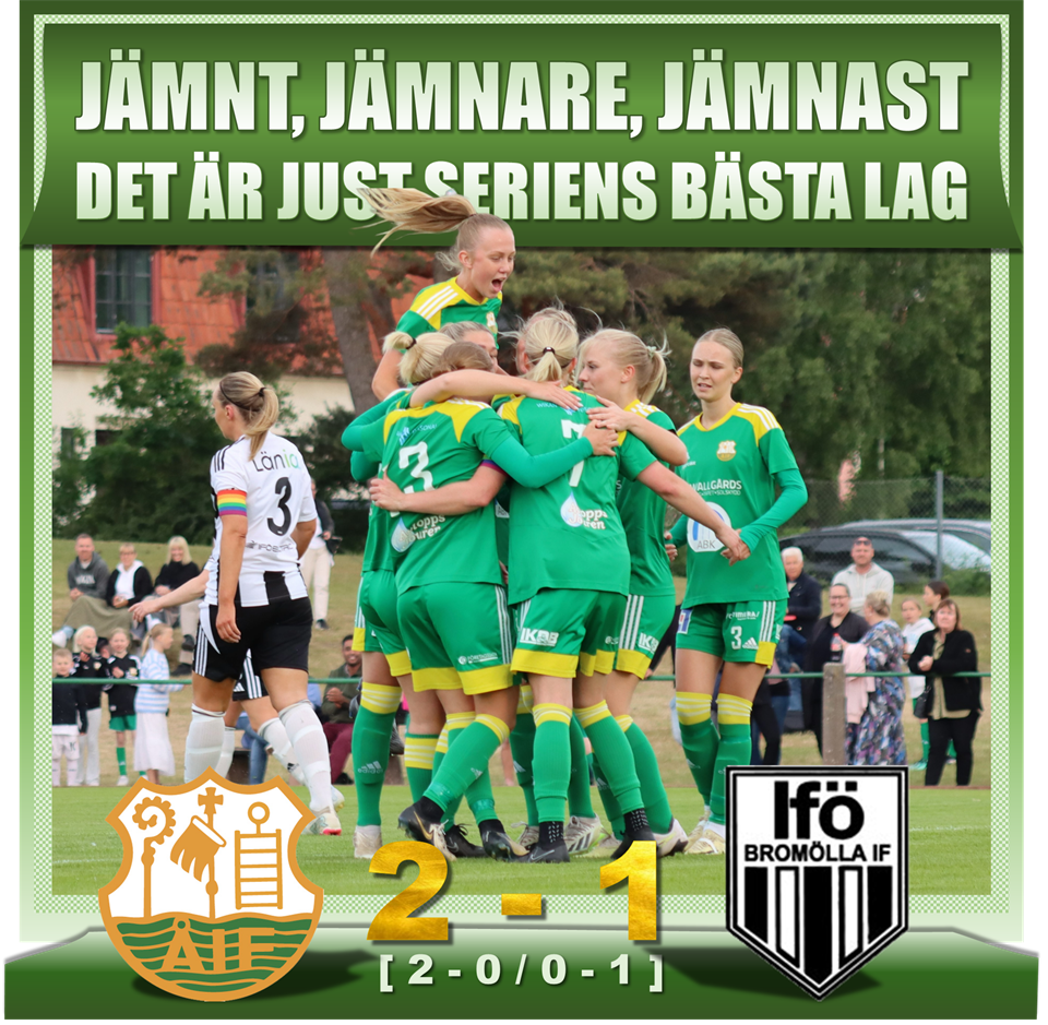 JÄMNT, JÄMNARE, JÄMNAST Det blev precis så jämnt och spännande som man hade hoppats på. Tack till alla som jobbade, tack till alla som kom. Det blev en fantastisk kväll, fin inramning i en match mellan seriens två bästa lag. Detta var första segern över Bromölla för Åhus IF i tävlingsmatch. Länk till fler bilder längre ner...det blev ganska många. Även på alla ungdomsspelare som gick in med lagen, och gick in i paus. Bilderna ligger på damlagets google-drive, fritt att ladda ner. ______________________ Släkten är värst – Wilma Olsson sänkte Ifö/Bromölla med drömmål Åhus IF vann seriefinalen mot Ifö/Bromölla med 2–1 (2–0) inför storpublik på Åhus IP. – En viktig seger. Det känns som att seriesegern står mellan oss och Bromölla, säger Wilma Olsson, som gjorde 2–0-målet för hemmalaget. Wilma Olsson är född och uppväxt i Bromölla. Inför säsongen bytte hon Lörby IF mot Åhus IF – och i seriefinalen mot Ifö/Bromölla kom första fullträffen i Åhuströjan. – Helt perfekt. Jag kunde inte önskat mig ett bättre tillfälle, säger Wilma, på klockren Bromölladialekt. Ifö/Bromölla inledde seriefinalen klart bäst. Gästerna tryckte ner hemmalaget och ett ledningsmål hängde i luften. Då, från ingenstans, tilldöms Åhus en straff. Ellen Elmvik dras omkull och domaren Tobias Andersson pekar på straffpunkten. Rutinerade Josefine Mårtensson gör inget misstag och så är det 1–0 till hemmalaget. En kalldusch för Ifö/Bromölla och ett mål som tog Åhus in i matchen. Tio minuter efter ledningsmålet kommer 2–0. Ett sagolikt mål. Ett klassavslut. Och ett samarbete ur den högre skolan. Saga Jontoft tittar upp, chippar in bollen i straffområdet till Wilma Olsson som drar till direkt på volley. Utan chans för målvakten Mathilda Carneklo. – Jag får bra träff, säger Wilma, och berättar att det var hennes första mål för säsongen. – Tidigare har jag mest huserat på det centrala mittfältet men nu på slutet har jag fått chansen på topp. Var trivs du bäst? – Gissa, säger Wilma, och ler. – Nä, men just nu har jag inget emot att vara anfallare. Ifö/Bromölla gjorde vad man kunde för att ta sig in i matchen. Bara under de fem avslutande minuterna i första halvlek hade laget tre (!) vassa målchanser. Men Emmy Thyberg, 18, i hemmamålet storspelade. – Jag fick göra några räddningar i början och det gjorde att man blev varm i kläderna, säger målvakten som tränar med KDFF och spelar matcherna för Åhus IF. – Det är en bra deal. Jag behöver spela matcher för att utvecklas. Stjärnmålvakten utsågs till matchens lirare, men fick dock inte hålla nollan. I den 86:e matchminuten reducerade Tilda Agardius till 1–2. Backen fick på en riktig drömträff där bollen gick raka vägen upp i Thybergs högra kryss. – Surt att inte få hålla nollan, men samtidigt får man applådera ett sånt mål. Hon får en makalös träff, säger Emmy Thyberg. ”Surt att inte få hålla nollan, men samtidigt får man applådera ett sånt mål. Hon får en makalös träff.” Emmy Thyberg, målvakt i Åhus IF. Ifö/Bromölla saknade skyttedrottningen Nadja Andersson som var avstängd. I halvtid klev dessutom anfallskollegan Ebba Järvensivu av eftersom hon skulle jobba natt på kommunen. In från bänken kom då Jindra van Reeden. Anfallaren som bor och studerar i Luleå sedan två år tillbaka. – Jag är hemma på sommarlov och blev spelklar idag, säger 28-åringen, som var inblandad i ett par farligheter. – Det var kul att spela men trist att förlora. Hur många matcher kommer du att spela? – Jag är kvar fram till uppehållet, så ett par-tre matcher hoppas jag på, säger anfallaren. Resultatet innebär att Åhus IF drygade ut serieledningen ner till Ifö/Bromölla. Nu skiljer det fem poäng mellan lagen. Tränaren Chris Namputu tar dock inte ut något i förskott. – Vi tar en match i taget. Inför matchen hade vi fem spelare på skadelistan och på uppvärmningen tvingades även Alice Nordenberg att kliva av så jag är grymt imponerad över hur tjejerna tacklar matchen, säger Chris Namputu, som nu laddar för en historisk DM-kvartsfinal på tisdag. – Vi möter Lilla Torg på hemmaplan och förhoppningsvis blir det lika mycket publik då. Fotboll, division 2 damer Åhus IF–Ifö/Bromölla IF 2–1 (2–0) Målen: 1–0 (12) Josefine Mårtensson, straff, 2–0 (23) Wilma Olsson, 2–1 (86) Tilda Agardius. Varningar: Åhus IF: Emmy Thyberg, Elin Sjöström. Publik: 285. Kristianstadsbladet _______________________________ MATCHBILDER & BILDER PÅ UNGDOMSLAGEN