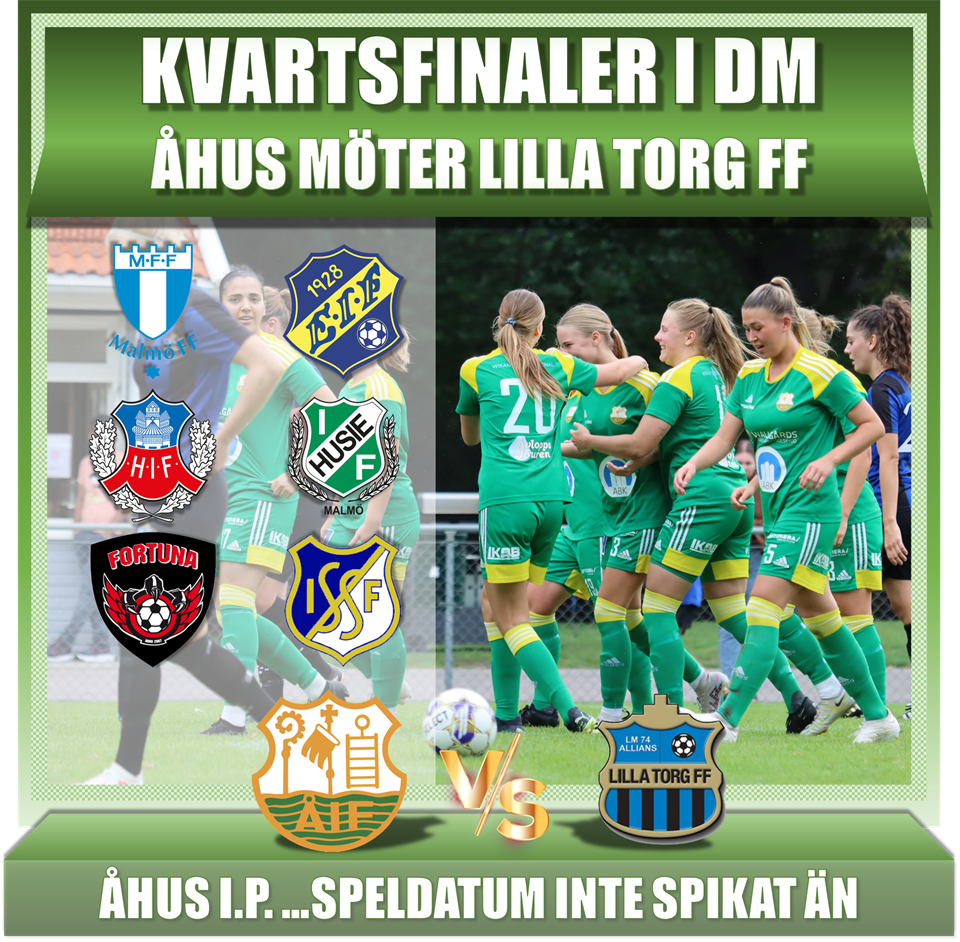 ÅHUS IF LOTTADES MOT LILLA TORG FF I KVARTSFINALEN Det blev ett division 2-lag från Västra serien, Lilla Torg FF som Åhus IF tar sig an i kvartsfinalen av DM. Lagen möttes förra säsongen, då slutade med förlust på hemmaplan under våren, men Åhus vann i Malmö med 0-2. Lilla Torg FF slog ut Vellinge IF (som leder div 2 Västra) i åttondelen, efter mållös match och straffar som gick till 7e rundan innan Lilla Torgs målvakt kunde sätta den avgörande straffen. Övriga kvartsfinaler Malmö FF-Eskilsminne IF Fortuna FF-Södra Sandby IF Helsingborgs IF-Husie IF Det blev således ingen ranking vid lottningen, Eskilsminne IF, som leder division 1 lottades mot Elitettanlaget Malmö FF. Ett av de två kvarvarande division 3-lagen [Husie IF] fick ta sig an tvåan i division 1, Helsingborgs IF. Det andra laget från division 3, Fortuna FF kommer möta Södra Sandby IF. Matcherna kan börja spelas från nu och till 12e juni. MATCHBILDER LILLA TORG FF-ÅHUS IF 2023 08 27 DM SLUTSPEL 2024