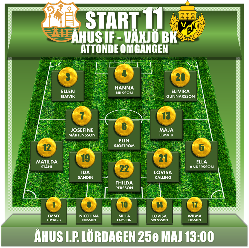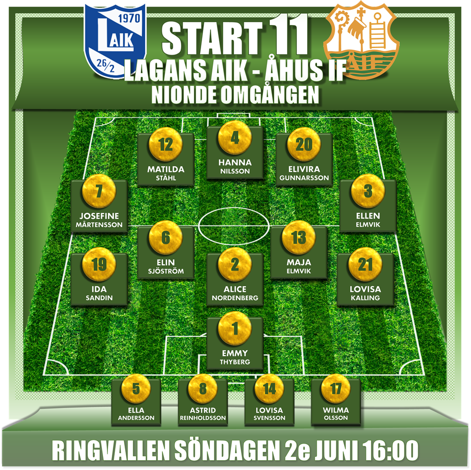 START 11 - LAGANS AIK - ÅHUS IF Den mest nordliga bortamatchen, mot seriejumbon Lagans AIK. Åhus ställer upp med följande trupp som innehåller en debutant i damlaget. Det ser ut att bli en tryckande hetta under matchen, med viss risk för åska. NR-NAMN-MATCHER-POSITION 1-Emmy Thyberg-6 [MV] 19-Ida Sandin-109 [YB] 2-Alice Nordenberg-8 [MB] 21-Lovisa Kalling-25 [YB] 6-Elin Sjöström-12 [DM] 13-Maja Elmvik-137 [DM] 7-Josefine Mårtensson-119 [OM] 3-Ellen Elmvik-23 [OM] 12-Matilda Ståhl-76 [F] 4-Hanna Nilsson-20 [F] 20-Elvira Gunnarsson-14 [F] 5-Ella Andersson-51 [A] 8-Astrid Reinholdsson-1 [A] [DEBUT] 14-Lovisa Svensson-25 [A] 17-Wilma Olsson-13 [A]