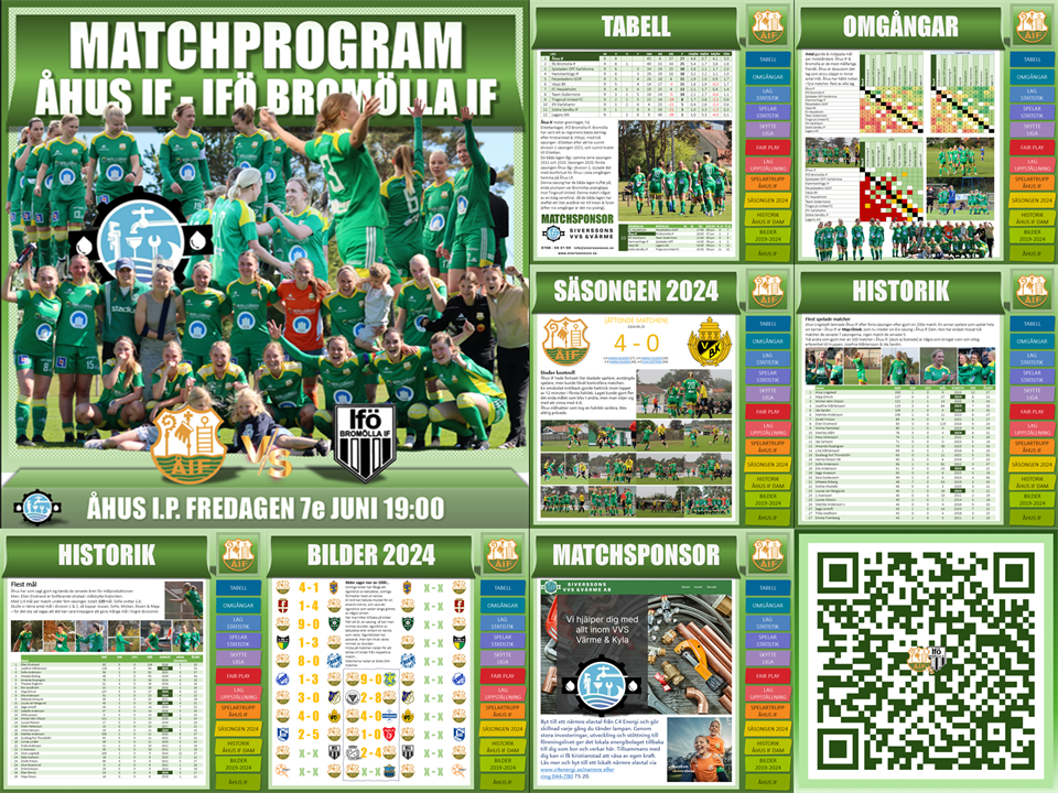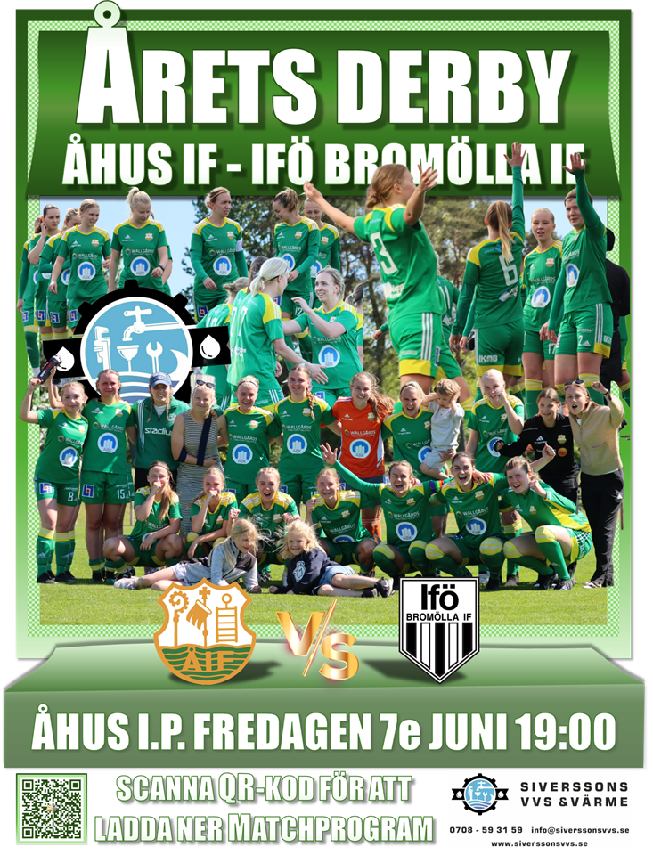 EN HÄNDELSERIK VECKA STUNDAR En vecka fylld av skolavslutningar & studentfirande, ska rundas av med toppmatchen, den tidiga seriefinalen, en efterlängtad derbydrabbning. Åhus IF tar emot serietvåan, rutinerade IFÖ Bromölla IF, ett av regionens främsta damlag de senaste 10 åren. Lagen har turats om att leda serien under året, just nu med Åhus två poäng före IFÖ Bromölla IF. I förra omgången spelade båda lagen målrika matcher, där Bromölla var värst och bankade in tio mål på Hammenhög. Åhus IF har nu nio poäng ner till 3an & 4an i tabellen. Matchprogrammet är uppdaterat med all nödvändig statistik, och all onödig. Det finns länkar till alla målen under året, samt bilder från de senaste 5 åren. Historik över alla spelare i Åhus IF damlag sedan 2010. Matchdag: Fredag, den 7e juni Matchstart: 19:00 Plats: Åhus I.P.