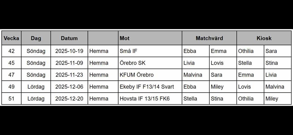 Följ oss för uppdateringarHär kommer schema över kiosken och sekretariatet på hemmamatcherna. Kan man inte på sin tilldelade dag får man byta, meddela även oss ansvariga i så fall (Lotta för sek och Björn för kiosk). Hojta till om ni önskar en genomgång för vad som ska göras så planerar vi in ett tillfälle för genomgång av sekretariatet och kiosken!