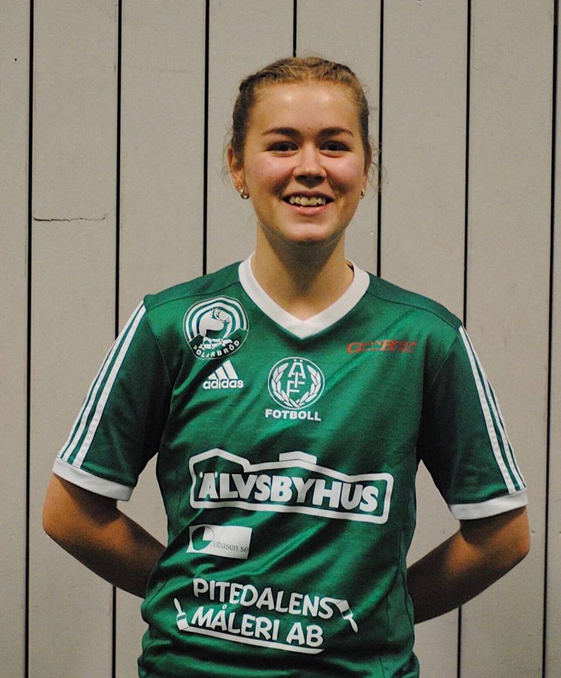 Hej! Mitt namn är Vendela Olovsson jag är 20 år gammal och bor i Älvsbyn. Jag har spelat fotboll i Älvsbyn i 13 år och under dessa 13 år har jag hunnit spela alla positioner på plan utom målvakt och min nuvarande position är mittback, men jag spelar gärna centralmittfältare också om jag får chansen. Mina förväntningar för den här säsongen är att vi ska få ännu bättre lagsammanhållning och ha kul tillsammans, men det roligaste på fotbollsplan är ju att vinna så därför hoppas jag även att vi kan vinna nog många matcher för att ta steget upp i division 2!! Vi har ju inte hunnit ha så många träningar än men jag är jättetaggad på den här säsongen, och det känns som det kommer bli superbra med våra nya tränare som kommer in med lite nytt perspektiv så vi kan utvecklas mer både individuellt och som ett lag!