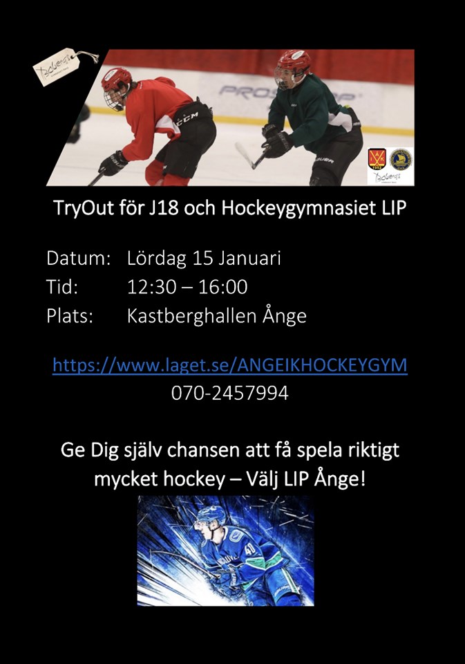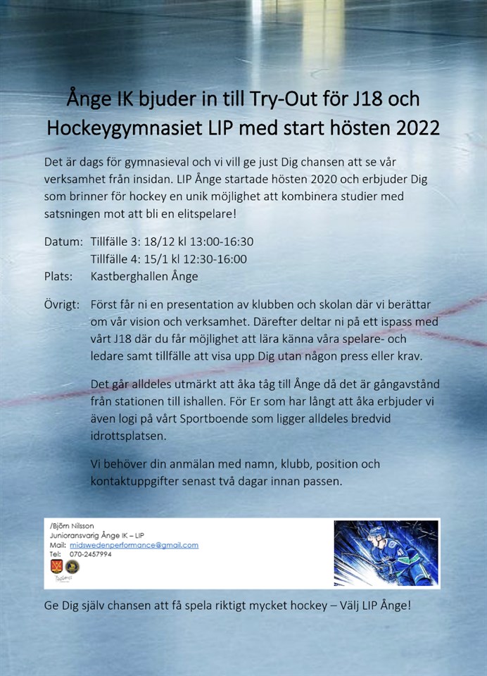 Nu är det dags för den sista officiella träffen inför gymnasievalet där spelare/elever födda 2006 får chansen att visa upp sig och få information om LIP Ånge. Skulle man ha förhinder nu kommer det erbjudas möjlighet att få träna med vårt J18 under säsongen. Kontakta i så fall oss så bokar vi in något som passar. Covid-19 Vi följer de rekommendationer som gäller och ber Er göra detsamma. Har man symptom stannar man hemma och vi ser då till att ni får all information digitalt. Vi har även goda möjligheter att se matcher via Svenskhockey.tv om det inte går att genomföra ett provspel. Varmt välkomna till Ånge IK och Bobergsgymnasiet - Nu kör vi!
