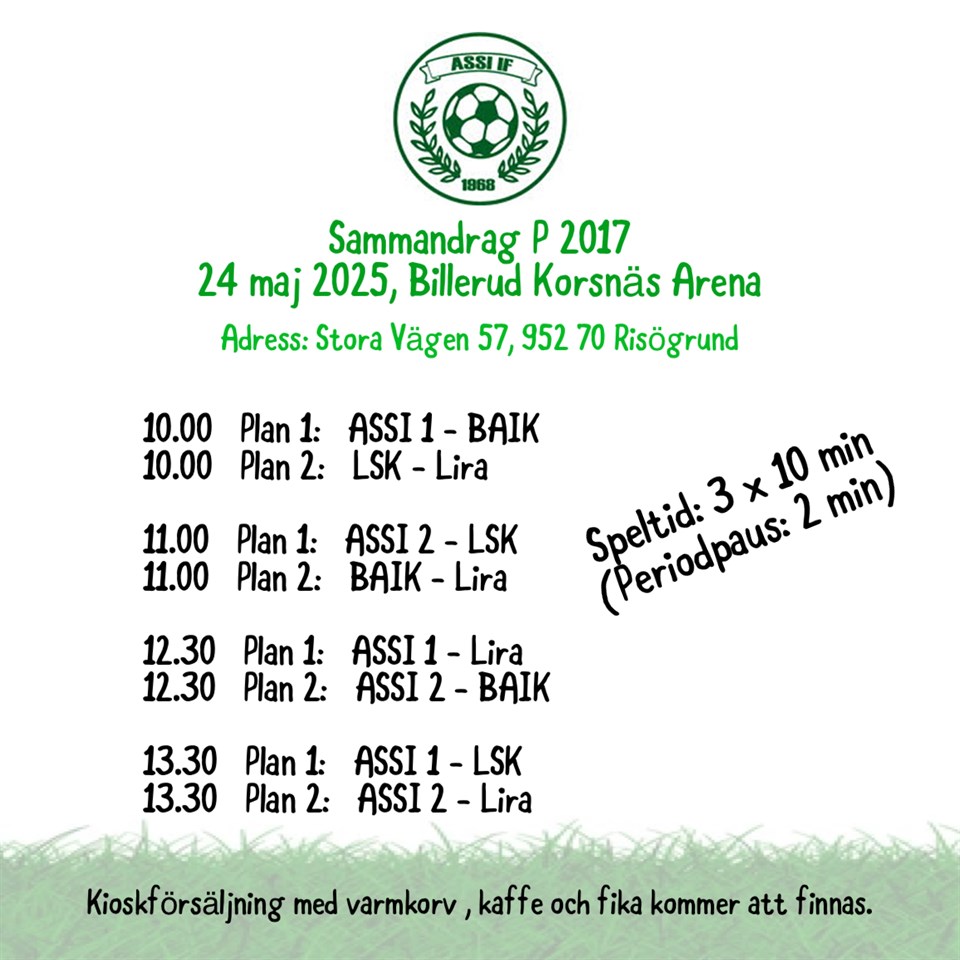 På lördag är det dags för första sammandraget. Svarta strumpor, svarta shorts/byxor och svart t-shirt/tröja. Har man inte en ASSi-tröja går det lika bra med en annan svart. Lag 1: ledare Marie Matcher: 10.00, 12.30 och 13.30 (samtliga matcher på plan 1) Loke Loui Theodor Sune Filip Ebbe Malte Lag 2: ledare Hanna Matcher: 11.00 (plan 1), 12.30 (plan 2) och 13.30 (plan 2) Alfred Anton Nils Ted Loa Kevin Lex Vidar Samling inför samtliga matcher, är 15 minuter innan matchstart. Vi ser fram emot en rolig fotbollsdag tillsammans.