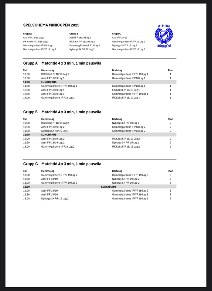 Hej! På lördag är det dags för matcher. Varje lag spelar tre matcher. Vi träffas i Nyborg kl10:15. Matchkläder: svart tröja/mörk tröja, svarta shorts, svarta strumpor, benskydd och skor. Glöm inte drickaflaska. Vid frånvaro önskar vi att ni meddelar här på laget så vi vet i så god tid som möjligt. Lag 1 Joar Nils Jamie Ivan Måns Viggo J Alfred Leon Ledare: Sofia o Sara Lag 2 Milton Edvin Sigvard Charlie Wilhelm Viggo J-A Oskar Ledare: Glenn Vi ser framemot en rolig och lärorik dag! Och till er föräldrar. Er uppgift är att heja på laget, inte coacha. Vi hejar på laget och inte på individen! Pojkar 2018-2019 12 jun 2025 0kommentarer