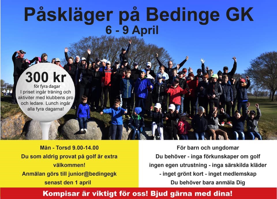 Bedinge ordnar ett påsklovsläger . De hälsar att alla Abbekåsare är varmt välkomna. Mån 6/4-tis 7/4 för alla nybörjare.9-14 Ons 8/4- tors 9/4 till alla som har Hcp. Pris 150 kr för 2 dagar inklusive lunch. Om läget ändras kommer info här. Anmäl gärna ert intresse till lina.evald@hotmail.com vi det vidare till Bedinge. Även äldre juniorer från Bedinge är anmälda och hoppas på jämnåriga spelare! Bilden kan innehålla: en eller flera personer, text och utomhus Juniorer 25 mar 2020 1kommentar