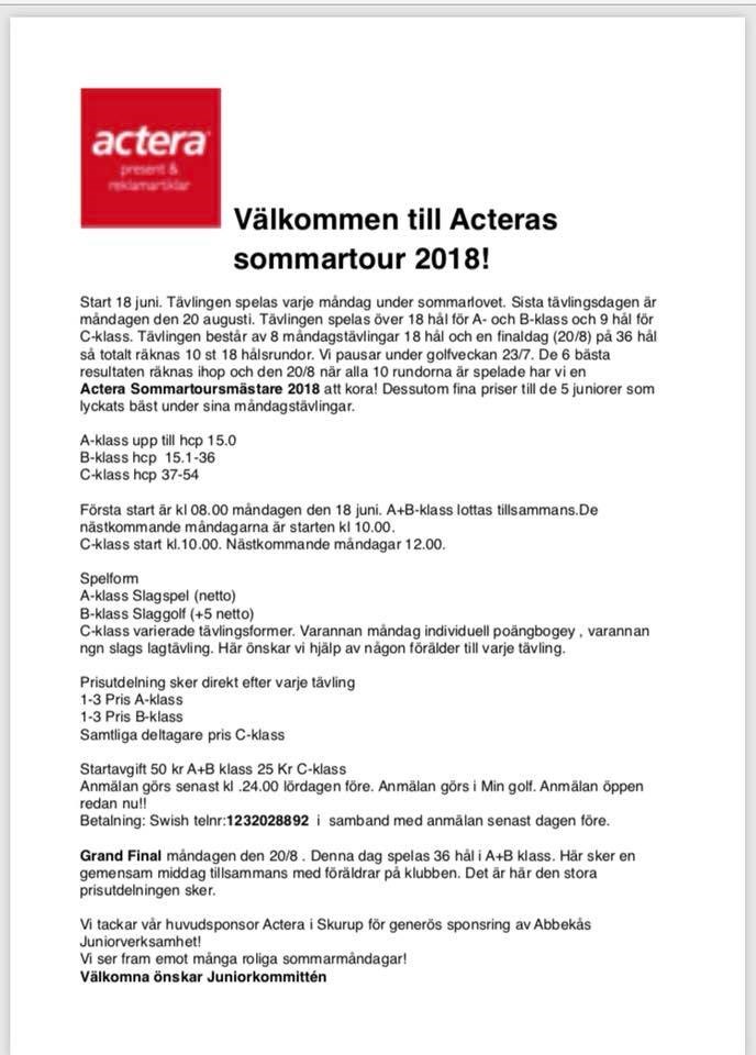 Söndagenden 17e juni är det läger hemma på Abbekås GK. In och anmäl er på länken senast 8e juni. https://goo.gl/forms/xDnGFBIHn4qI7MCA3 Dagen efter är det premirä för Actera Sommartour! In och anmäl er mingolf.se Glöm inta att också anmäla er till Teen Cup som spalas samtidigt. Mer info om Actera Sommartour finns under dokument. Juniorer 31 maj 2018 0kommentarer