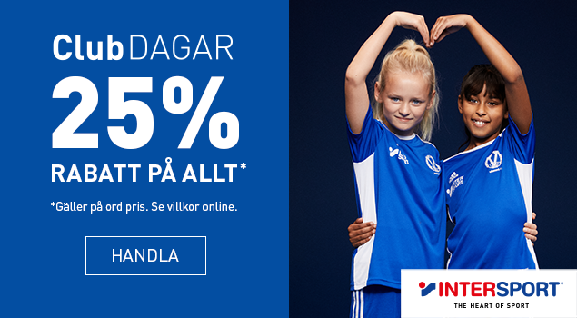 Hej på er! Mellan den 23/9 - 2/10 har vår samarbetspartner Intersport 25% på allt i butik och på intersport.se, ett perfekt läge att köpa det ni behöver för höstens alla aktiva dagar. När du handlar på Intersport är du samtidigt med och stöttar vår förening. För du har väl valt att stötta vår förening lite extra under ”Mina sidor”? Detta gäller för dig som redan är eller blir Clubmedlem hos Intersport. Vänligen, Åby Tjureda IF