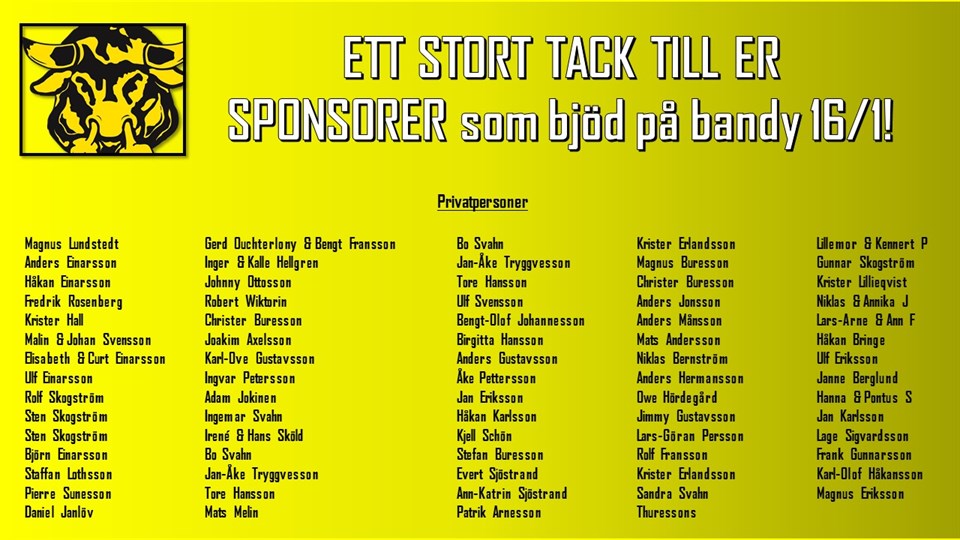 Tack alla ni som bidrog och gjorde det möjligt att bjuda vår publik på gratis inträde vid dagens match mot Boltic Privatpersoner Magnus Lundstedt Gerd Ouchterlony & Bengt Fransson Bo Svahn Krister Erlandsson Lillemor & Kennert P Anders Einarsson Inger & Kalle Hellgren Jan-Åke Tryggvesson Magnus Buresson Gunnar Skogström Håkan Einarsson Johnny Ottosson Tore Hansson Christer Buresson Krister Lillieqvist Fredrik Rosenberg Robert Wiktorin Ulf Svensson Anders Jonsson Niklas & Annika J Krister Hall Christer Buresson Bengt-Olof Johannesson Anders Månsson Lars-Arne & Ann F Malin & Johan Svensson Joakim Axelsson Birgitta Hansson Mats Andersson Håkan Bringe Elisabeth & Curt Einarsson Karl-Ove Gustavsson Anders Gustavsson Niklas Bernström Ulf Eriksson Ulf Einarsson Ingvar Petersson Åke Pettersson Anders Hermansson Janne Berglund Rolf Skogström Adam Jokinen Jan Eriksson Owe Hördegård Sten Skogström Ingemar Svahn Håkan Karlsson Jimmy Gustavsson Sten Skogström Irené & Hans Sköld Kjell Schön Lars-Göran Persson Björn Einarsson Bo Svahn Stefan Buresson Rolf Fransson Staffan Lothsson Jan-Åke Tryggvesson Evert Sjöstrand Krister Erlandsson Pierre Sunesson Tore Hansson Ann-Katrin Sjöstrand Sandra Svahn Hanna & Pontus Sandström May Ryde Lage Sigvardsson Frank Gunnarsson Karl-Olof Håkansson Magnus Eriksson Daniel Janlöv Mats Melin Patrik Arnesson Thuressons