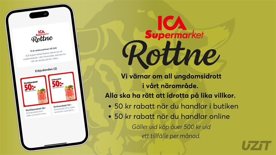 Få 100 kr i rabatt hos ICA Supermarket Rottne varje månad - så ser Uzit’s senaste kanonerbjudande ut! Inte nog med att Uzit idag är Sveriges bästa plattform för köp och sälj av sport- och fritidsartiklar. Det finns mer… Som en del i Uzit finns erbjudanden från några av Sveriges starkaste och mest populära varumärken. Företag som delar våra värderingar och tror på idrottens starka krafter. Sälj dina prylar smidigt i Uzit-appen och skänk minst 10% till vår klubb och ungdomsverksamhet. Det tjänar både du, klubben, miljön och den nya ägaren på. Genom att ni dessutom använder erbjudanden från Uzit’s värdepartners varje månad blir Uzit en bra affär för alla! Ladda ner appen redan nu, flera erbjudanden finns redan färdiga att nyttja och fler kommer adderas kontinuerligt. » Ladda ner Uzit här » Se alla erbjudanden Jörgen Linnér 0708-28 66 55 Åby/Tjureda IF Uzit Sverige AB - Idrottens köp- och säljapp Hemsida E-post highfive@uzit.se