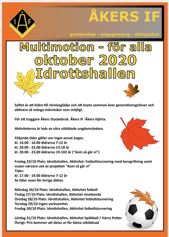 Multimotion – motion för alla Syftet är att bidra till rörelseglädje och att knyta samman över generationsgränser och aktivera så många människor som möjligt. För ett tryggare Åkers Styckebruk. Åkers IF -Åkers Hjärta Aktiviteterna är leds av våra utbildade ungdomsledare. OKTOBER Fredag 23/10 Plats: Idrottshallen Aktivitet: Fotbollsturnering med korvgrillning samt vuxen närvaro ute av projekt ”Kom så går vi” Tid 17,00-19,00 åldrarna: 7-12 år Tid 20,00-23,00 åldrarna: 13-18 år Tid 20,00- 23,00 åldrarna: 19-102 år (”Kom så går vi”) HÖSTLOVET Måndag 26/10 Plats: Idrottshallen Aktivitet: Fotboll Tid 14,00-16,00 åldrarna: 7-12 år Tid 20,00-23,00 åldrarna: 13-18 år Tid 20,00- 23,00 åldrarna: 19-102 år (”Kom så går vi”) Tisdag 27/10 Plats: Idrottshallen Aktivitet: Innebandy Tid 14,00-16,00 åldrarna: 7-12 år Tid 20,00-23,00 åldrarna: 13-18 år Tid 20,00- 23,00 åldrarna: 19-102 år (”Kom så går vi”) Onsdag 28/10 Plats: Idrottshallen Aktivitet: Fotbollsturnering Tid 14,00-16,00 åldrarna: 7-12 år Tid 20,00-23,00 åldrarna: 13-18 år Tid 20,00- 23,00 åldrarna: 19-102 år (”Kom så går vi”) Torsdag 29/10 Ingen verksamhet Fredag 30/10 Plats: Idrottshallen Aktivitet: Fotbollsturnering Tid 14,00-16,00 åldrarna: 7-12 år Tid 20,00-23,00 åldrarna: 13-18 år Tid 20,00- 23,00 åldrarna: 19-102 år (”Kom så går vi”) Lördag 31/10 Plats: Idrottshallen Aktivitet: Spökboll/Harry Potter med pris för bästa utklädnad. Vinnare meddelas kl 16,00, samt kl 22,30 Tid 14,00-16,00 åldrarna: 7-12 år Tid 20,00-23,00 åldrarna: 13-18 år Tid 20,00- 23,00 åldrarna: 19-102 år (”Kom så går vi”)