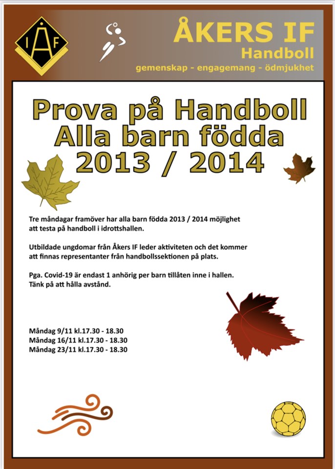 HANDBOLLSKUL! Alla barn födda 2013/14 är välkomna att prova handboll, tre måndagar i november. 17.30-18.30 i Åkersskolans gympasal. 9/11 16/11 23/11 Utbildade ungdomar från Åkers IF leder aktiviteten och det kommer finnas representanter från handbollssektionen på plats. Pga Covid-19 så är endast 1 anhörig per barn tillåten inne i hallen. Tänk på att hålla avstånd. VÄLKOMNA!