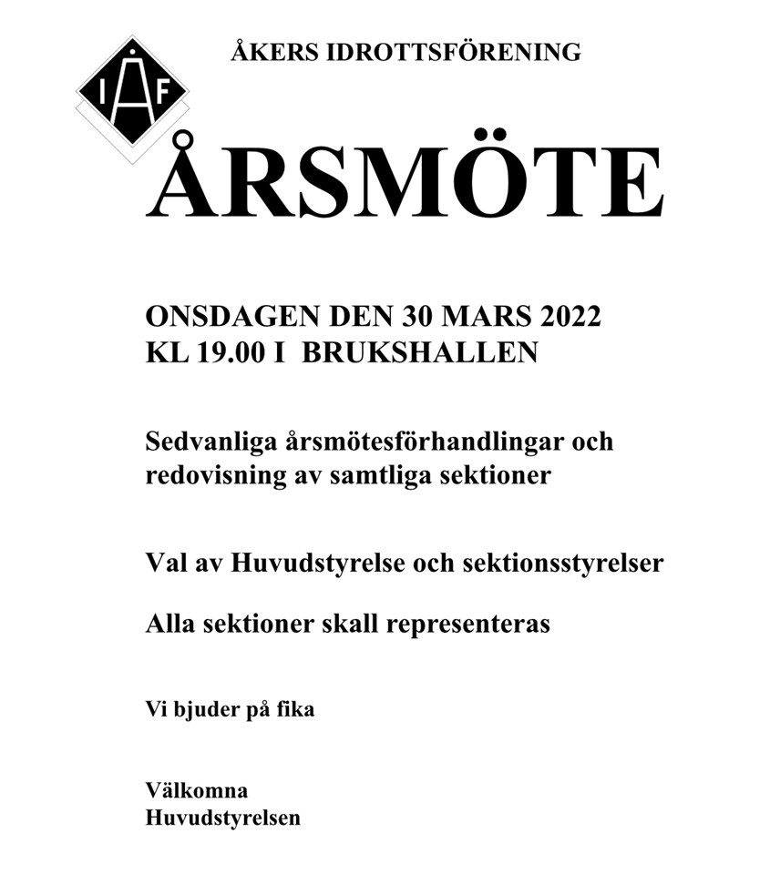 Varmt välkomna medlemmar! Onsdag 30/3- 2022 kl 19,00 i brukshallen. Sedvanliga årsmötesförhandlingar och redovisning av samtliga sektioner/ kommittéer Val av huvudstyrelse. Vi bjuder på fika! Välkomna! Huvudstyrelsen Åkers IF 21 mar 2022 0kommentarer
