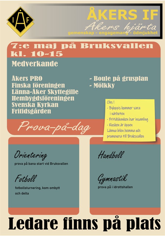 Välkomna till Bruksvallen Kl 10,00-15,00 PRO kommer och arrangerar Boule på grusplan Finska Föreningen kommer och arrangerar Mölkky Fler föreningar som deltar i dagen är: Länna-Åker Skyttegille Hembygdsföreningen Svenska Kyrkan Fritidsgården Sedan har vi våra egna sektioner och du kan prova på : Orientering (prova på bana start vid bruksvallen) Gymnastik (prova på i idrottshallen) Handboll Fotboll (fotbollsturnering kom ombytt och delta) Samma dag har även By-Loppis aktiviteter i anslutning till Bruksvallen och Fritidsbanken insamling till sommarens alla aktiviteter. Lämna bilen hemma och promenera till bruksvallen. Åkers IF 19 apr 2022 0kommentarer