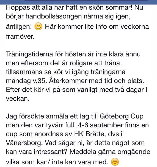 Hej alla! Avslutningen är mellan kl 09:30-14.00. Samling för laget 09:30 ombyte till matchkläder 10:00. Inmarch och Medaljutdelning, mixad handbollsturnering, nummerboll, cafeteria samt godisregn. Vi önskar få in hembakat till cafeterian. Minst tre hembakat från varje lag. Vi ansvarar för sekretariatet. Obs! Imorgon är det föräldramöte 19:15 i gymnasiet. Träning 18:00. Med vänlig hälsning, tränarna A-Pojk (P-04/05) 4 maj 2015 0kommentarer