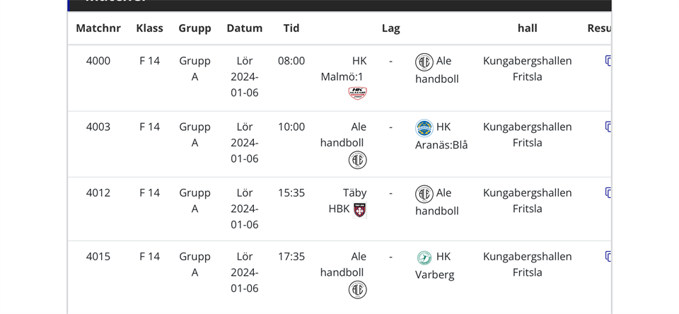 Hej alla Vi träffas i Kungabergshallen i Fritsla kl 07.10 ombytta och klara. Alla ska ha med sig utomhusskor och varmakläder för promenad under dagen. Spelschema för lördagen, Kungabergshallen: Kl 08.00 HK Malmö - Ale Handboll Kl 10.55 Ale Handboll - HK Aranäs Kl 15.35 Täby HBK - Ale Handboll Kl 17.35 Ale Handboll - HK Varberg Mellan andra och tredje matchen kommer vi gemensamt ta oss till en pizzeria i Fritsla. Förutom det tänk på att ta med er mellanmål och vatten flaska. Vi ser framemot en rolig helg tillsammans. Med vänlig hälsning, Ledarna