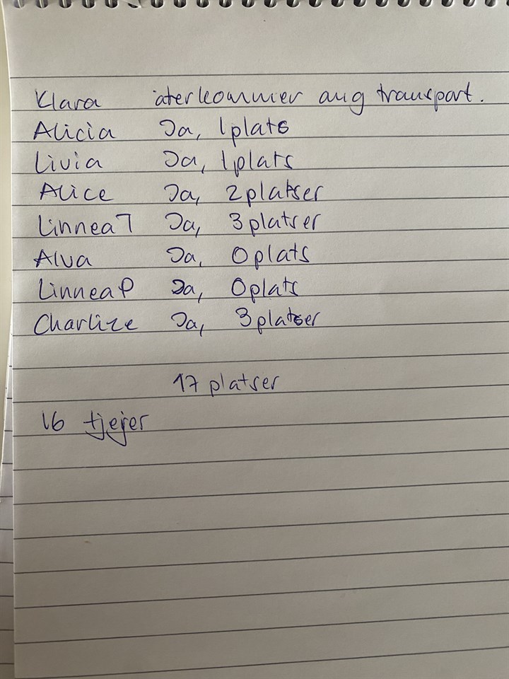 Hej, Tacksam för återkoppling om platserna i bilarna, se bild. Behöver detta för att planera och att det finns platser för alla. Namnet är det hens föräldrar som kör: barnet + antal platser utöver sitt egna barn som står bredvid. Stämmer antal platser? Mvh, ledarna