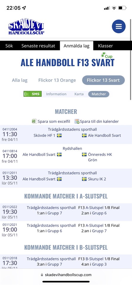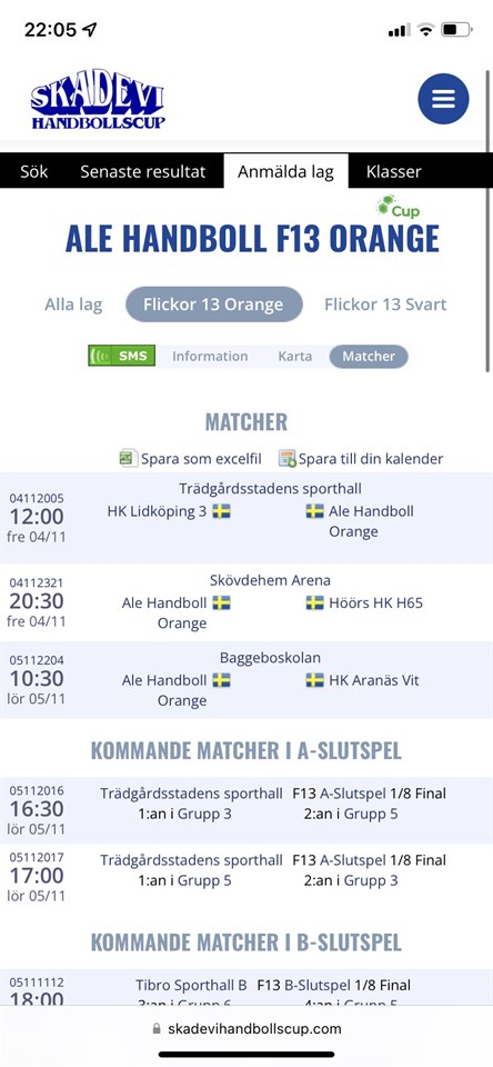Hej alla, Nu närmar vi oss Skadevi cup..ska bli super kul Det är 19 tjejer och 3 ledare som åker, fördelat på 2 lag. Enligt spelschemat spelar vi våra första matcher i samma hall / Trädgårdshallen den ena laget kl 11.30 och det andra laget kl 12.00 på fredagen. Bifogar även spelschema för den andra gruppen i ytterligare nyhet. Vår plan är att vi åker hemifrån/från Ale på fredagen den 4/11 vid kl 08.00. Vi behöver anmäla antal deltarkort och ev allergier. Därav vill vi att ni så fort som möjligt meddelar allergier/specialkost, dock senast imorgon lördag den 15/10 kl 17.00. Vi kommer köpa deltagarkort för fredag-söndag = 1190 kr. Lagkassan sponsrar med 500 kr per person, vilket blir att varje tjej som åker med betalar 690 kr. Swisha Malin 070-5566127 som har hand om lagkassan. Vi har behov av hjälp med transport mellan matcherna i Skövde, ca 3 bilar. Ni som har möjlighet att hjälpa till hör av er till Pernilla 0705-411015, snarts möjligast. Förslag på placklista: - Uppblåsbar madrass (endast singelbredd, EJ dubbelbredd) eller liggunderlag - Sovsäck eller lakan och täcke, kudde - Något att sova i, kan bli kallt i klassrummet - Necessär: (tandborste, tandkräm, tvål, schampo, balsam, borste, hårband) - Handduk (dusch och händer) - Badtofflor - Träningsoverall att ha mellan matcherna - Matchtröja och shorts. - Handbollsskor och vattenflaska. - Extra strumpor - Ombyte till 2 nätter + extra trosor, strumpor - Jacka / Regnjacka samt bra ute skor - Lördagsgodis - Mobiltelefon, laddare och hörlurar - Fickpengar - Ryggsäck eller annan mindre väska att packa i under matchdagarna (för handbollsskor, vattenflaska, frukt, extra strumpor + duschgrejor & ombyteskläder till kvällen) Undrar ni något så hör bara av er. Trevlig helg! Mvh, ledarna/Pernilla