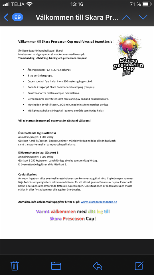 Hej tjejer! Hoppas ni alla har det bra,(och att ni saknar handbollen 😃) Vi har fått en fråga om vi vill vara med på en försäsongsturnering i Skara 17-19 september. Det kostar 995:-/ person då ingår 2 nätter på Skara sommarlands camping, måltider fredag(middag)- söndag(lunch) och transport från boende till hallarna. Vi hoppas ni hade tyckt det vore en rolig start på säsongen om vi kunde åka. Vid intresse smsa svar till 0707 44 55 92 för just nu går inte att göra anmälningar via laget. Det finns 8 platser varav 3 är tagna så svara gärna så fort ni vet om ni kan. Med vänlig hälsning, ledarna Damjunior (08/09) 23 maj 2021 1kommentar