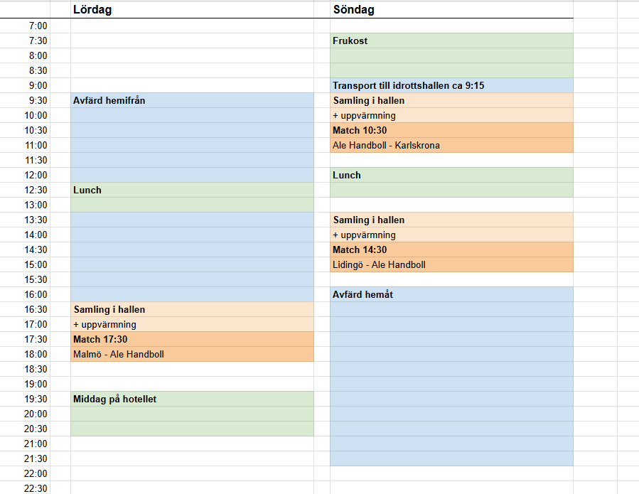 Hej! Lite mer detaljer om resan till Lidingö och USM Steg 4... Boende Denna gång bor vi på Lidingö Arena Hotell på Lidingö, Stockholmsvägen 35, 5-10 minuters bilväg från idrottshallen där vi spelar våra matcher. Kostnad för boende landar på 425 kr/spelare, inkl. frukost. Vi återkommer inom kort med instruktioner om betalning. Vi har tyvärr inte möjlighet att boka rum åt familjemedlemmar, utan ni föräldrar som åker med måste lösa boende på egen hand. Transport Första matchen startar enligt nuvarande schema 17:30, samling sker i idrottshallen en timme innan, dvs 16:30. Det tar knappt sex timmar upp till Lidingö, och med lunchstopp längs vägen kan det vara lagom att åka hemifrån ca 9:30. Om det blir gemensam lunch längs vägen återstår att se. Vi ska också undersöka en extra gång om vi har möjlighet att åka gemensamt, exempelvis med buss/minibuss. Om vi inte reser gemensamt har vi denna gång behov av att samordna så att alla har någon att åka med, men vi återkommer inom kort om det. Mat Vi räknar som vanligt med att behöva äta några gånger under helgen, och vi kommer inte ha möjlighet att göra egen mat, utan här får vi räkna med att äta ute någonstans. Kostnaden för mat har vi som förening/lag tyvärr inte möjlighet att ta, så här får ni räkna med en utgift. - Vi kommer äta middag på hotellet på lördagen, husmanskost till bra pris - vi återkommer för förhandsbeställning. - Frukost kommer också ätas på hotellet. - Lunch på söndagen har vi ännu inte bestämt, här tar vi gärna lite föräldrahjälp för att scouta. - När vi kommer upp till Lidingö skulle vi behöva få i killarna lite bra energi i ett mellanmål. Här tar vi också gärna emot hjälp av föräldrar för planering och inköp av något. Ni får gärna anmäla intresse för det i kommentar här. Packning Samma som förra gången... Eftersom vi bor på hotell behöver killarna inte ha med några sängkläder. Det viktigaste är naturligtvis: - kläder att träna i, inkl. skor - matchställ - handduk + duschtvål Matcherna spelas i Gångsätrahallen, med adressen Läroverksvägen 54, Lidingö. Matchernas tider ser ni i vår kalender. Det var nog allt för nu. Se bifogad bild för preliminärt schema. Med vänliga hälsningar, Tränarna