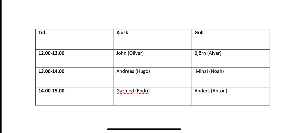 Här kommer ett schema där ni föräldrar har fått ett varsin tid, kommentera nedanför här att ni kan ta det arbetspasset ni fått tilldelat.