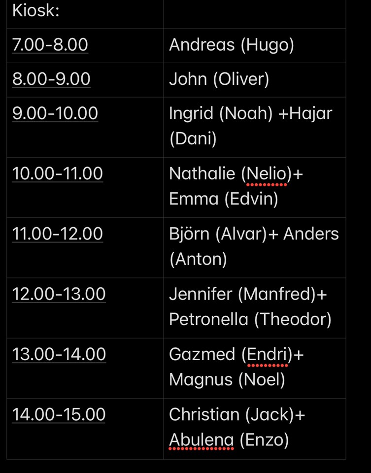 Hej! Jag har ingen möjlighet att stå i kiosken denna gång, då jag är ensam med 3 ungar och varav en är 1årig som kräver min fulla uppmärksamhet. Om nån skulle vilja stå för mig så skulle jag var ytterst tacksam.