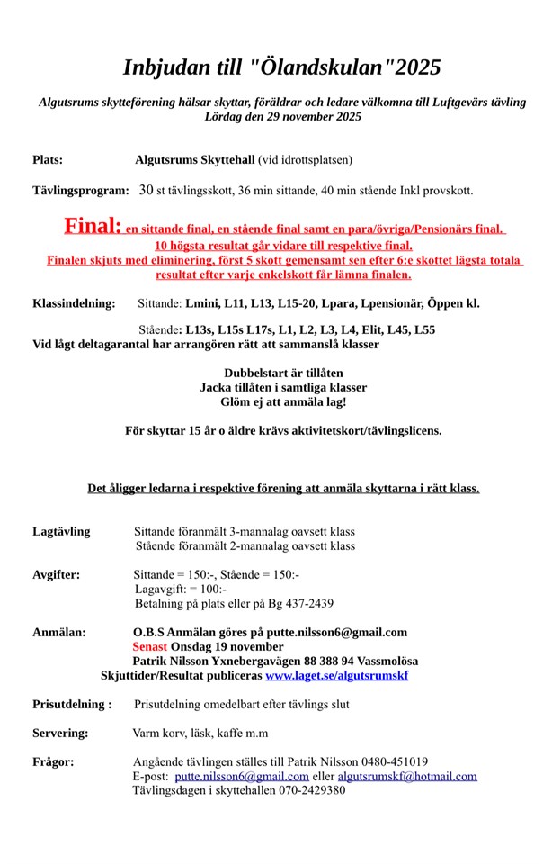 | Kvällsträning luftgevär | 26 nov, 17:00 |