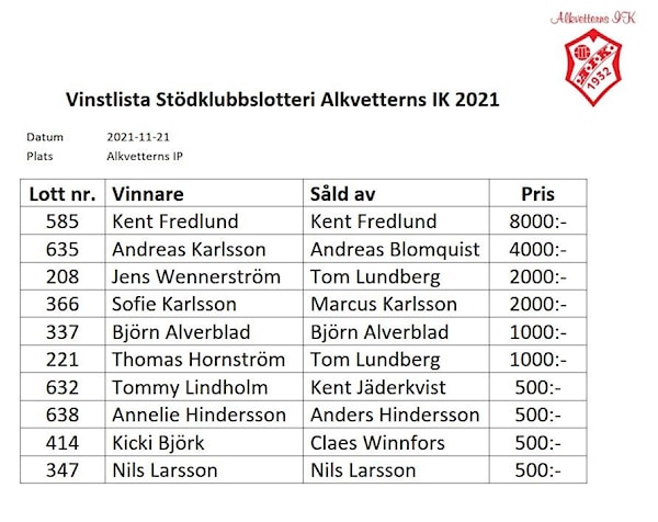 Dragning genomfördes i Alkvetterns IKs klubblokal 21/11 start 17.00.