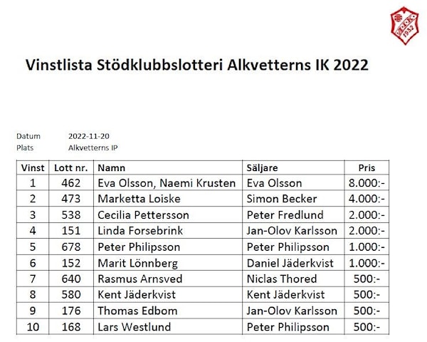 Dragnings genomfördes 20/11 kl.13.00 i Alkvetterns klubblokal