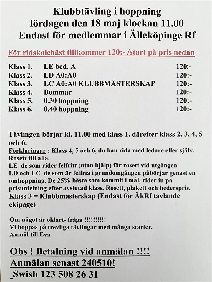 Klubbtävling, hoppning 18 maj Älleköpinge Ryttarförening 28 apr 2024 0kommentarer