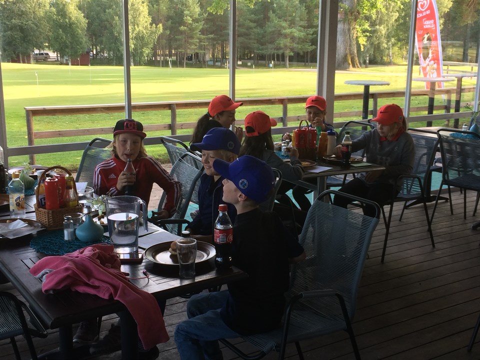 Det var välfyllt i restaurang Älvan på den avslutande GUSAB-sammankomsten. Hamburgartallrikarna stod som spön i backen, eller på borden i alla fall. Roligt att se så många tjejer har tagit till sig denna sport! Saknas på bilden gör Elsa (som värmde upp med hopprep och lek med Hooke). Även "stor-pojkarna" (Max, Pontus och Hannes) saknas på bilden, då de redan gett sig av på sin 18-håls runda (4:e omgången av Handelsbankens vandringspris). Vi från juniorkommitén vill tacka alla för det här året och välkomnar alla tillbaka till nästa års GUSAB!