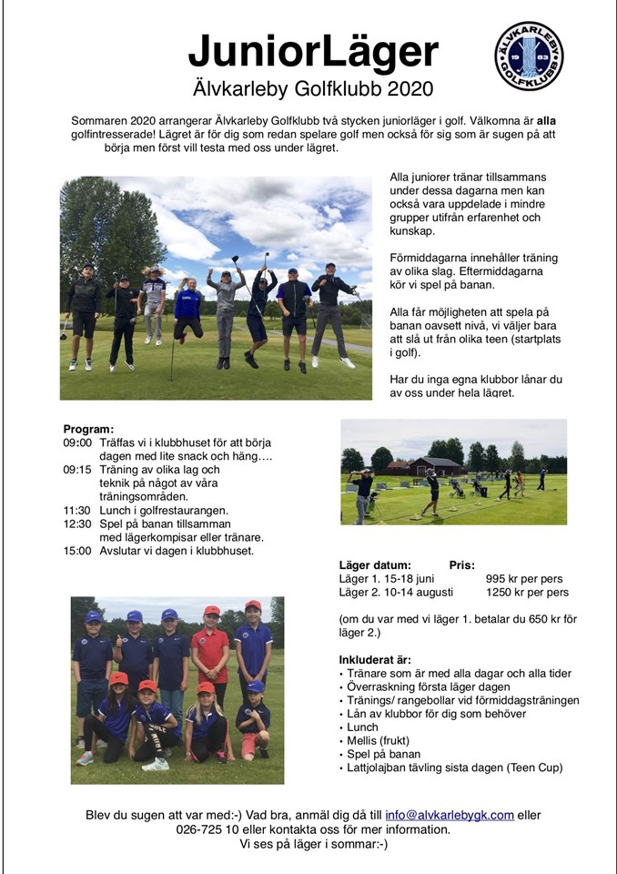 Det närmar sig juniorläger och det är dax att anmäla sig till vårt första läger som genomförs midsommarveckan måndag till torsdag. Inte missa att bli med på en av sommarens golfhighlights........ Älvkarleby GK 25 maj 2020 0kommentarer