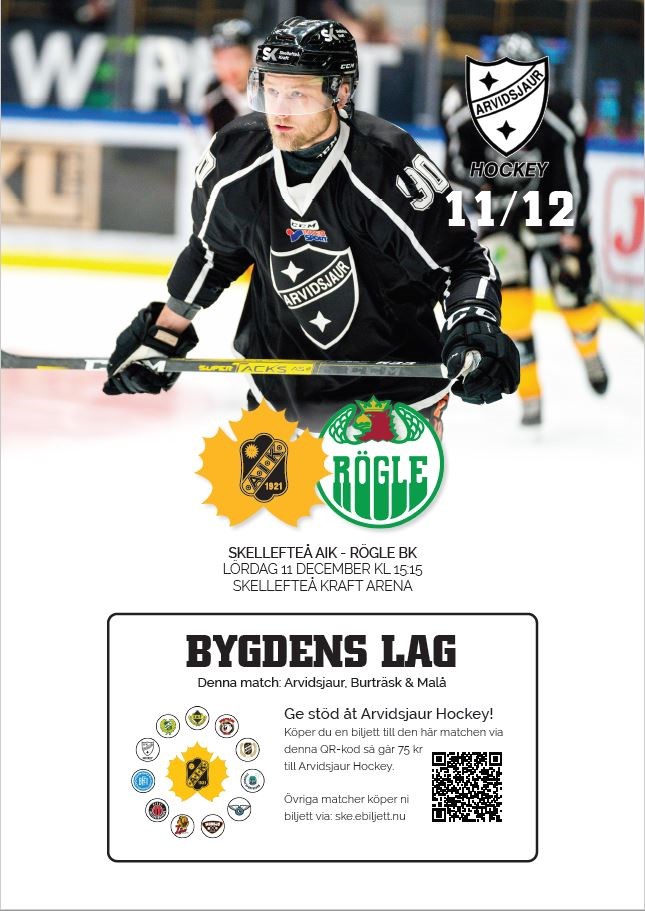 Lördag 11 december är Arvidsjaur bygdens lag i matchen Skellefteå AIK - Rögle. För varje såld biljett (via länken) får vår förening 75:- Samla familj och vänner och slut upp till en spännande hockeymatch. I pausen bjuds ni dessutom på en gullig uppvisning ;-) Sprid ordet, så att vi fyller läktarna och visar vilka som är bygdens lag, Arvidsjaur Hockey!
