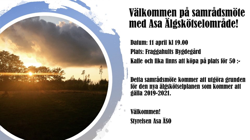 Välkomna på samrådsmöte i Fraggahults Bygdegård den 11 april, kl 19.00! Kaffe och fika finns att köpa på plats för 50 :-. Detta samrådsmötet kommer att utgöra grunden för den kommande älgskötselplanen som kommer att gälla 2019-2021. Kom och gör din röst hörd! Vänliga hälsningar Styrelsen Asa Älgskötselområde ASA Älgskötselområde 17 mar 2019 0kommentarer