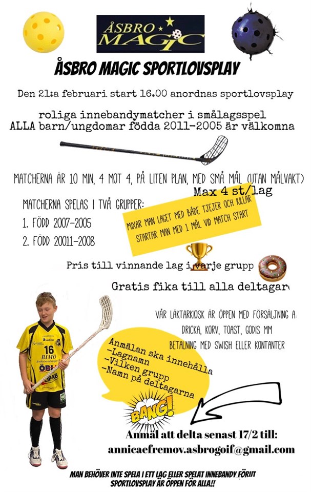 Välkommen på Åsbro Magic Sportlovsplay Den 21:a februari start kl.16.00 Roliga innebandymatcher i smålagsspel, ALLA barn/ungdomar födda 2011-2005 är välkomna, man behöver inte ha spelat innebandy förut eller vara med i ett lag. Det ska vara 4 st/lag Man spelar 4 mot 4, 1x10 min, liten plan på småmål utan målvakt Matcherna spelas i två grupper 1. Född 2007-2005 2. Född 2011-2008 Mixar man laget med både tjejer & killar startar man med 1 mål vid varje matchstart Anmälan ska innehåll: -Lagnamn - Vilken krupp - Namn på alla fyra deltagarna Maila anmälan till annicaefremov.asbrogoif@gmail.com SENAST 17/2 Pris till vinnande lag i varje grupp Alla deltagare bjuds på fika Vår fina läktarkisok kommer vara öppen med föräsljning av korv, toast, dricka, godis m.m Betalning med kontanter eller swish Åsbro GoIF 12 feb 2020 0kommentarer